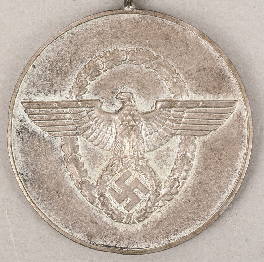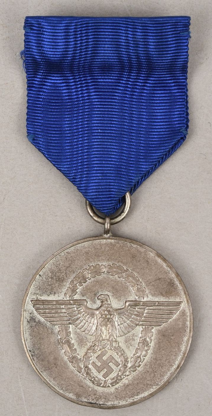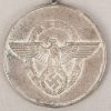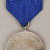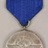 Constructed of die struck Tombak with a bright silver finish. The medal is complete with suepnsion ring and blue rayon ribbon. The ribbon has the fastening device still intact to the reverse. Surface shows some wear and the medal has a nice age patina.
