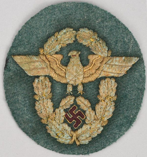 Hand embroidered police eagle in gilt bullion threads with black cotton swastika. All mounted on a police green cloth base. Un-issued example with some oxidation to the bullion. Reverse with intact black, protective paper backing.