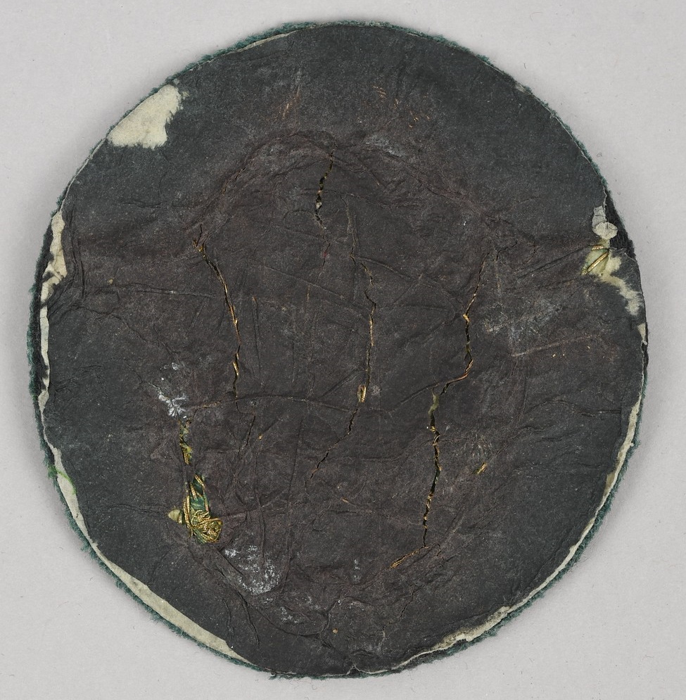 Hand embroidered police eagle in gilt bullion threads with black cotton swastika. All mounted on a police green cloth base. Un-issued example with some oxidation to the bullion. Reverse with intact black, protective paper backing.
