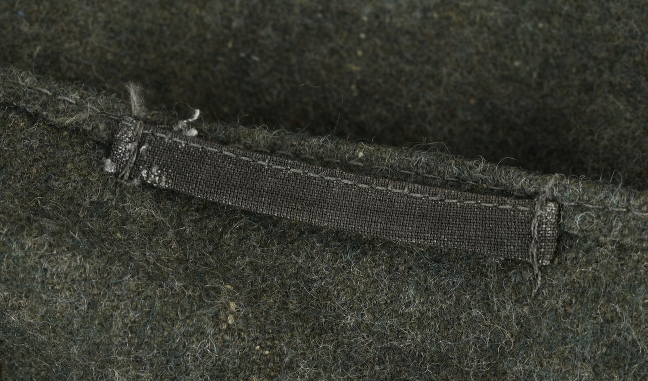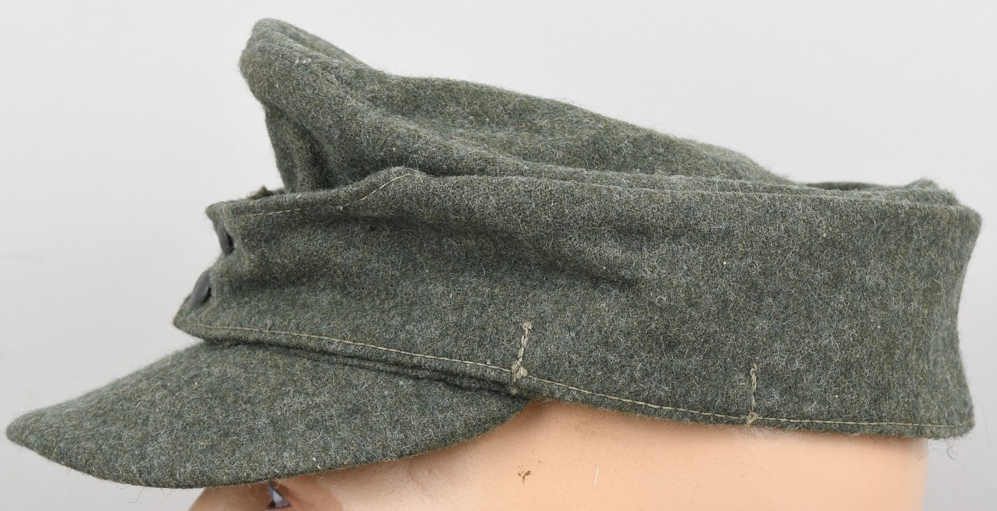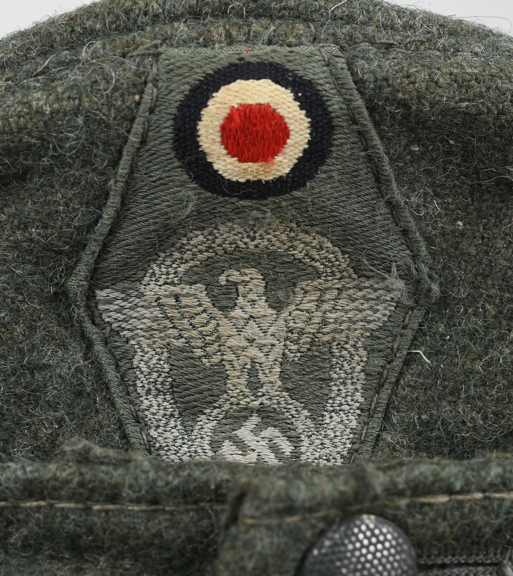 Field grey wool cloth construction cap features fold down back and side panels with a downward scalloped front edge and forward sides and two, small, field-grey painted, pebbled sheet metal closure buttons to the front center. The front center of the cap has a combined, second pattern, machine woven, wreathed police eagle in mouse grey threads and a national tri-color cockade on a woven, green rayon base. The insignia is machine sewn to the cap. The cap has an extended, cloth covered, forward visor with a pliable, internal stiffener with a subtly raised lip to the top of the forward edge and a single row of reinforcement stitching to the bottom of the forward edge. The interior of the cap is fully lined in grey rayon. Lining is clearly marked with a R.F.Nr. 1944 (year of production) and “55” which is the size of the cap. The cap shows clear signs of real use. No rips, tears or mendings.