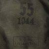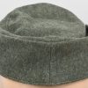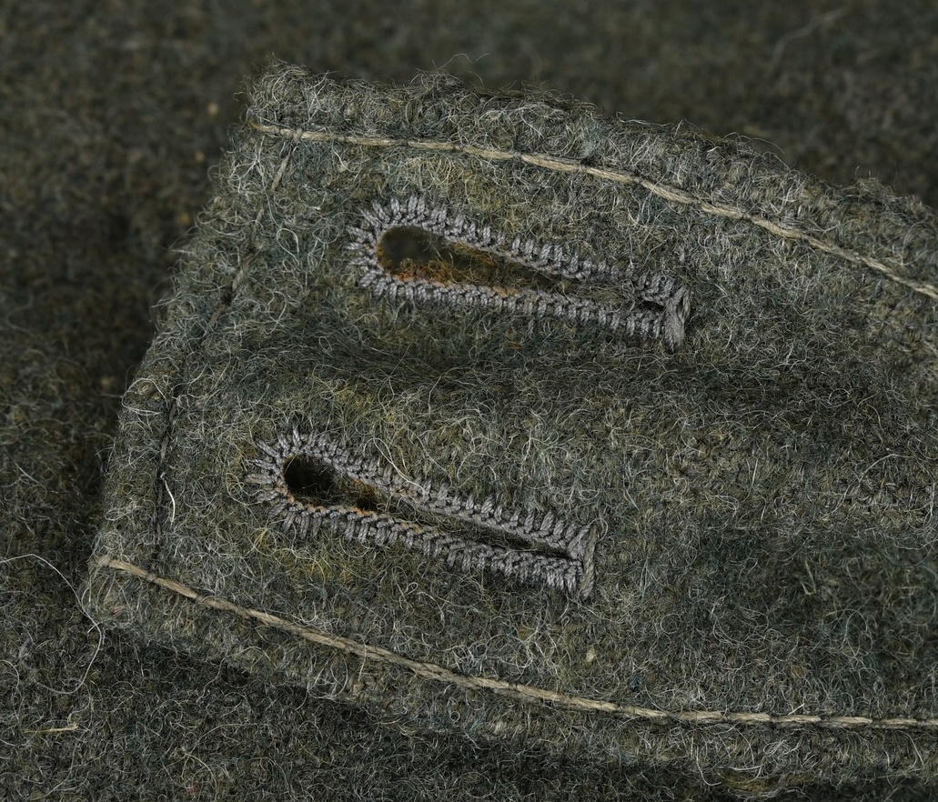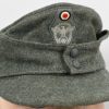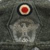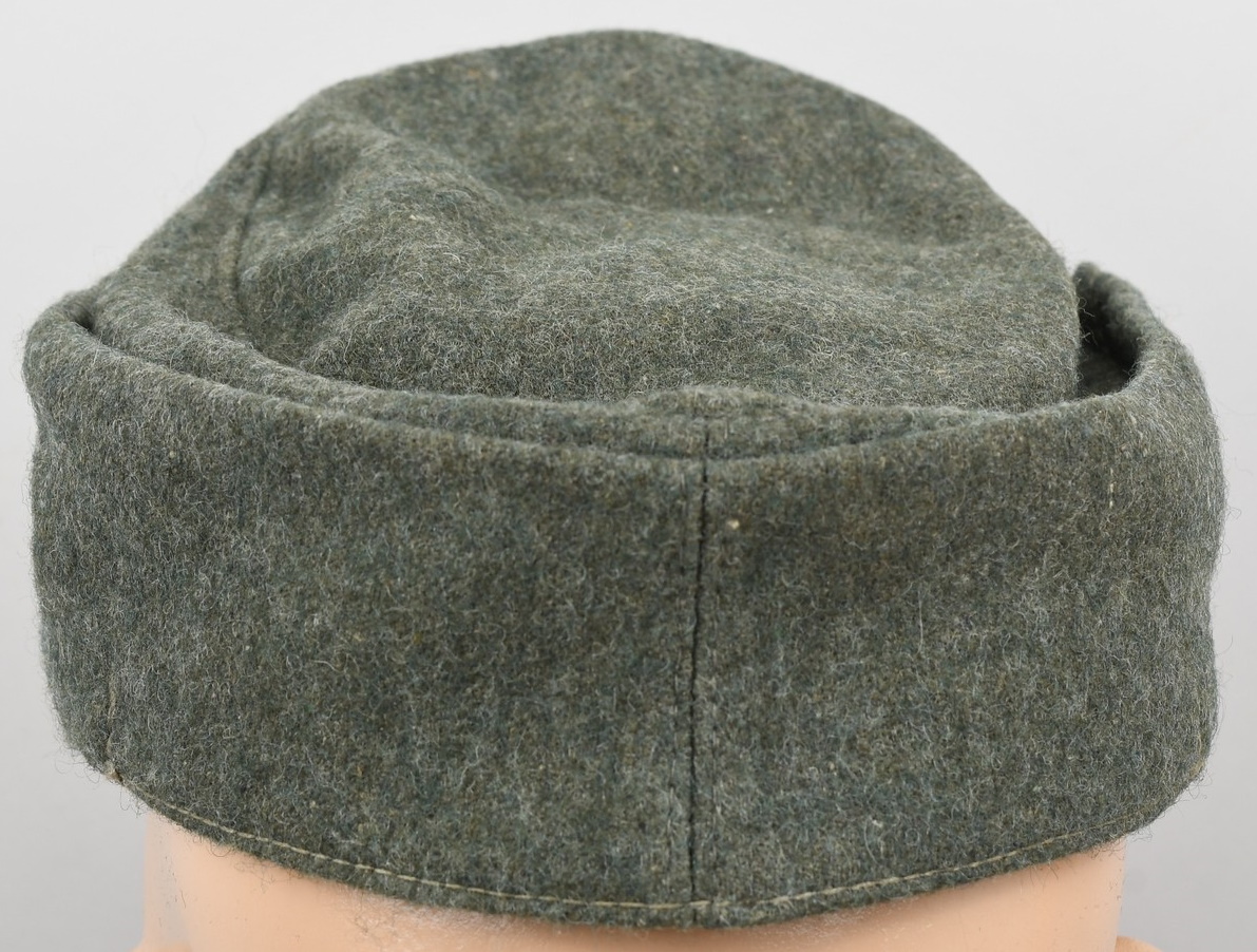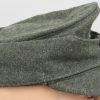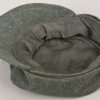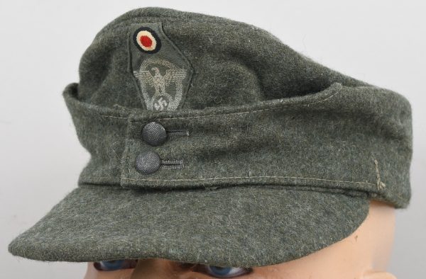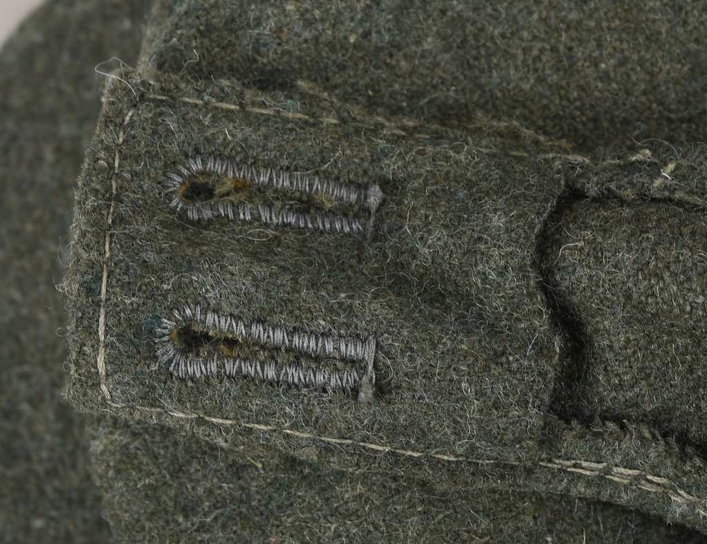 Field grey wool cloth construction cap features fold down back and side panels with a downward scalloped front edge and forward sides and two, small, field-grey painted, pebbled sheet metal closure buttons to the front center. The front center of the cap has a combined, second pattern, machine woven, wreathed police eagle in mouse grey threads and a national tri-color cockade on a woven, green rayon base. The insignia is machine sewn to the cap. The cap has an extended, cloth covered, forward visor with a pliable, internal stiffener with a subtly raised lip to the top of the forward edge and a single row of reinforcement stitching to the bottom of the forward edge. The interior of the cap is fully lined in grey rayon. Lining is clearly marked with a R.F.Nr. 1944 (year of production) and “55” which is the size of the cap. The cap shows clear signs of real use. No rips, tears or mendings.