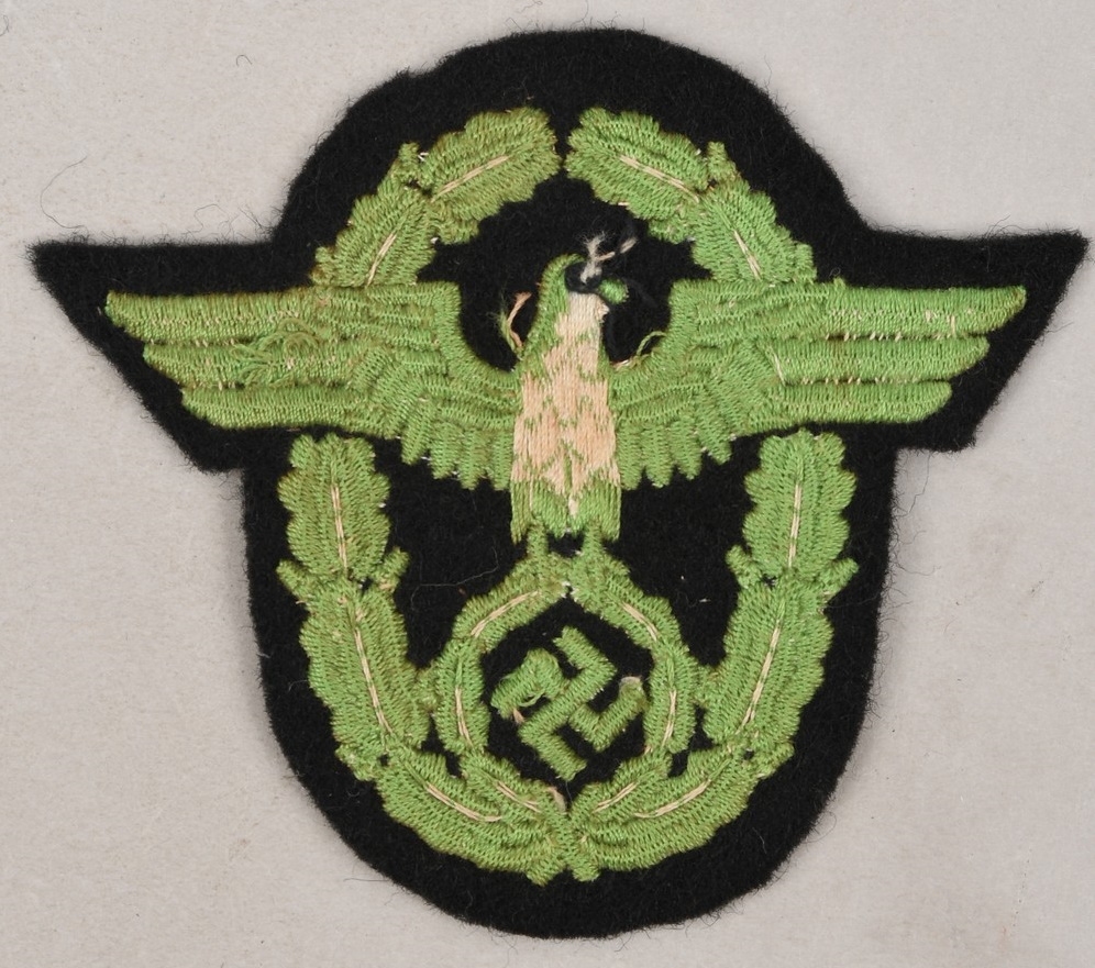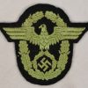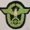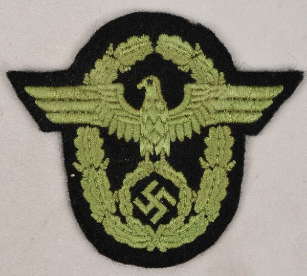 Very rare “schutz-polizei” sleeve eagle. Black cloth backing with machine embroidered national police eagle in green cotton threads. The eagle is in good condition with light signs of age.