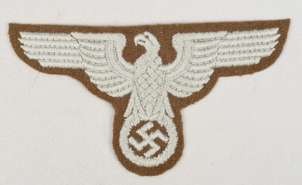 1936 pattern, die stamped alloy construction national eagle. Reverse of the eagle is a mirror image of the obverse. Both of the two original attachment prongs are intact. Maker marked “M1/17”.