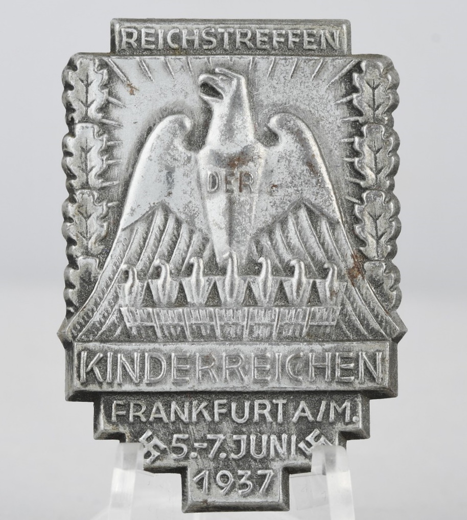 Constructed out of die stamped ferrous metal base that has been silver washed. To obverse reads “Reichstreffen der Kinderreichen Frankfurt A/M. 5.-7. Juni 1937”. The hollow back reverse has a well working, soldered on, steel pin assembly. It meassures aprox 46mm x 32mm. The badge is in very good condition with most of the original silver wash still intact.