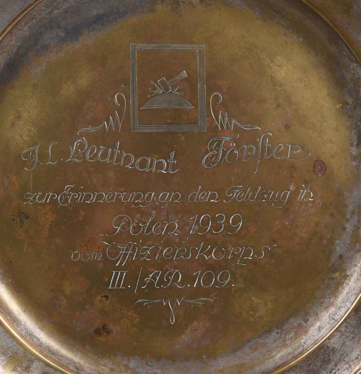 Plate made of brass with a Bright silver wash. An emblem is nicely etched to the top front of the plate in the form of a hammer hitting the ground (probably the units tactical symbol). The plate was a gift from the Officers korps to J. L Förster for the participation in the Polen war Campaign. The plate shows signs of age and has lost some of its silver finish but is still in good condition. The plate meassures 24 x 24 cm.