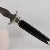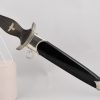 Late “RZM” dagger features a double edged, drop forged steel, nickel/silver plated blade with a low central ridge. The nickel/silver plated blade shows scabbard runners and light surface spotting but is still quite clean and bright with most of the original cross graining still being visible. The obverse of the blade has a nice, deep, well defined acid etched motto: “Meine Ehre Heißt Treue”. The reverse of the blade has a well defined acid etched “RZM” logo, SS runics and maker code “1211/39” for “E Pack & Sohn”. The dagger comes with a alloy metal cross guard, pommel and tang nut. The nicely shaped grip has a nice fit to the cross guard and pommel fittings. There is a couple of minor chips and wear marks to the grip. The grip has a solid metal/silver national eagle and enameled SS button nicely fit in place. The dagger comes with a black magnetic sheet metal scabbard with solid nickel/silver fittings. The top scabbard fitting retains both of its dome headed retaining screws and the hanger suspension ring and loop.