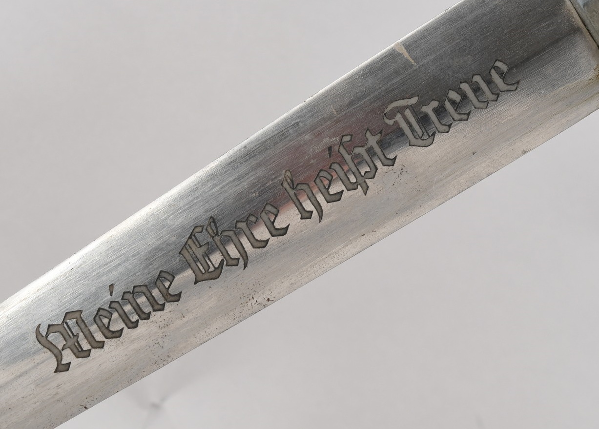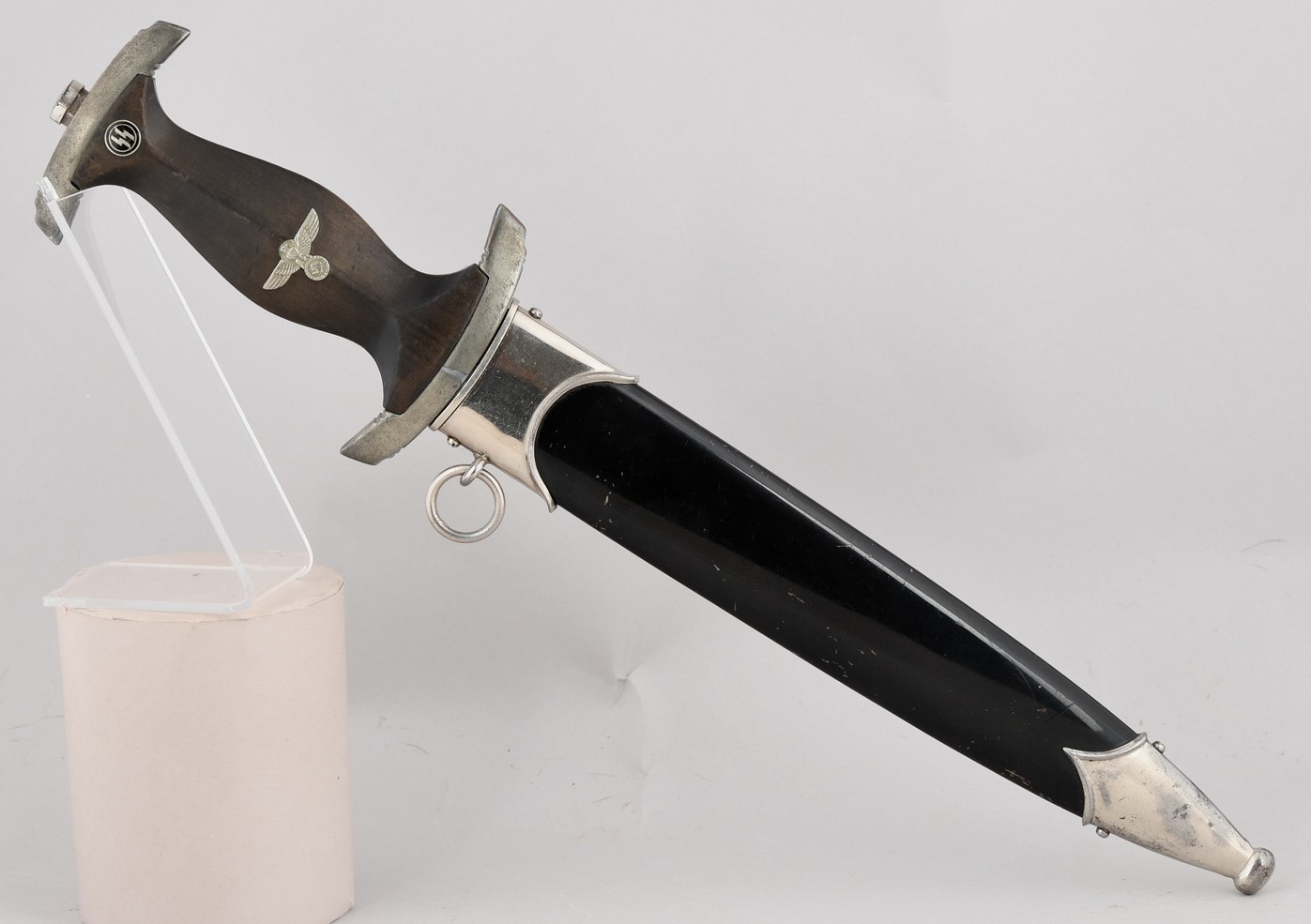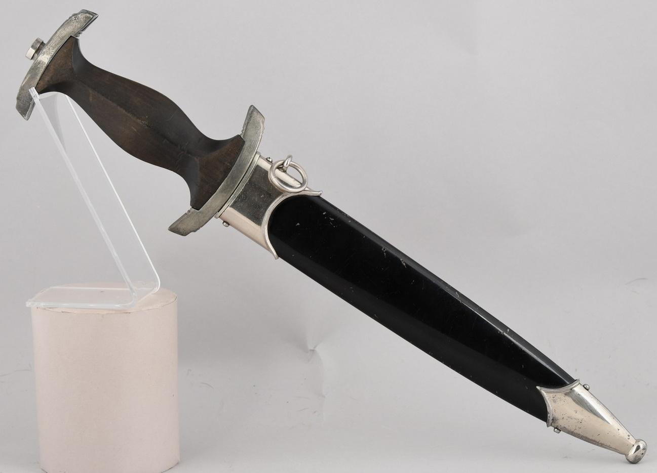 The SS M33 service dagger was introduced on December 15th 1933 for wear by all full SS members, regardless of rank. The dagger was intended as an ornamental item and the design was based on the traditional 16TH century Swiss “Holbein” hunting dagger as was being utilized for the SA personnel’s dagger with a different coloration and insignia. The daggers were bestowed annually to newly accepted SS members at 10:00pm on the anniversary of the unsuccessful Beer Hall Putsch, (November 9TH), in front of the Feldherrnhalle in Munich. Originally the daggers featured an anodized scabbard and utilized nice quality solid nickel/silver fittings until roughly early 1937 when the scabbards began to have a painted finish and cheaper nickel/silver plated fittings replaced the earlier solid nickel/silver fittings in 1938.
