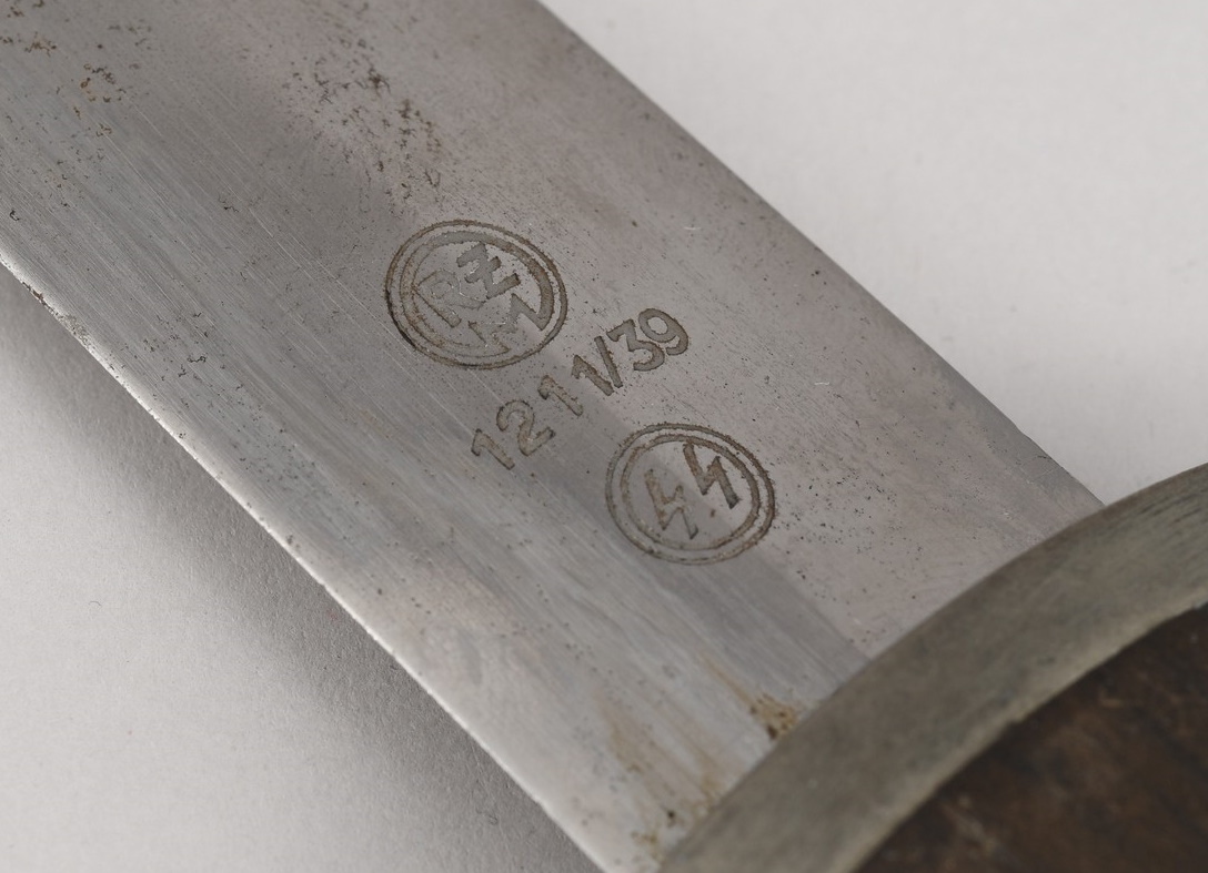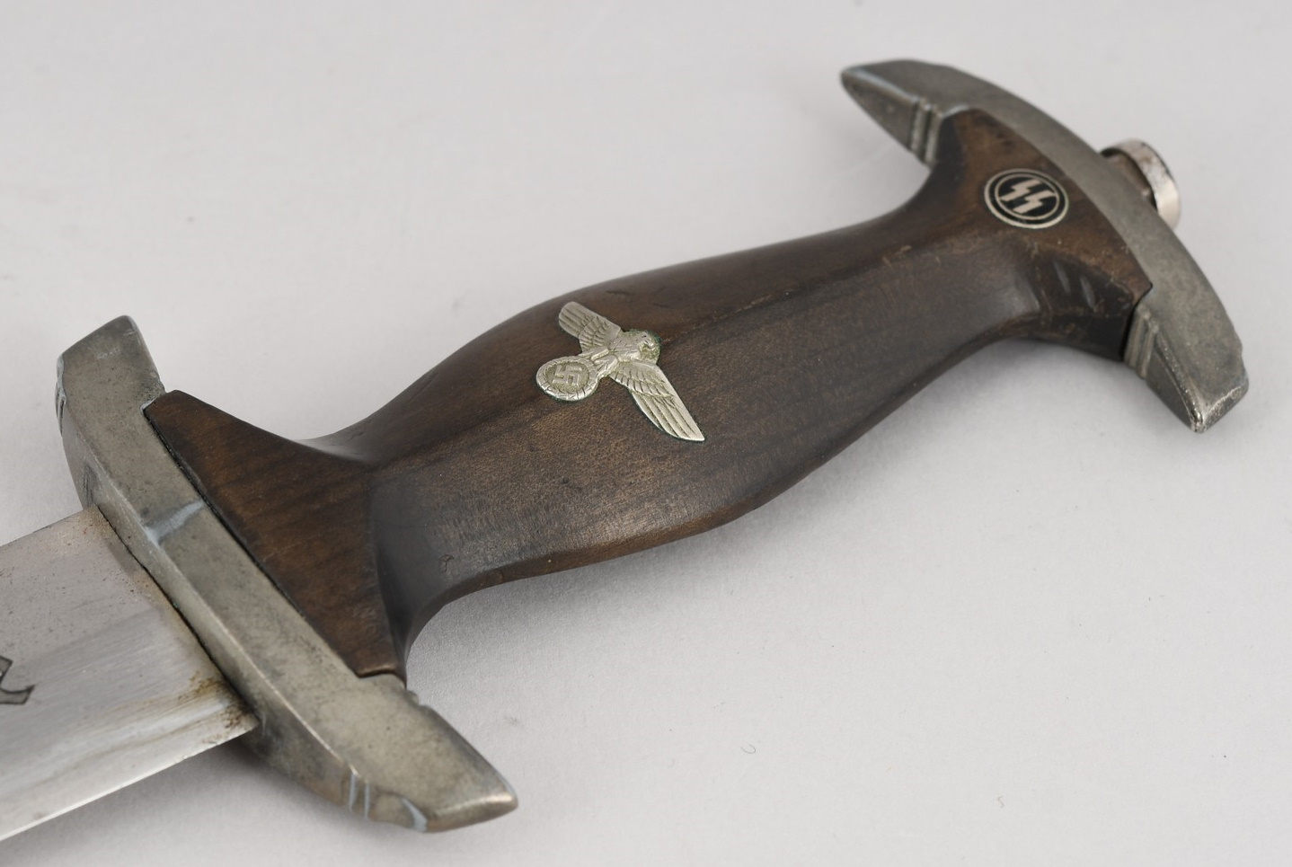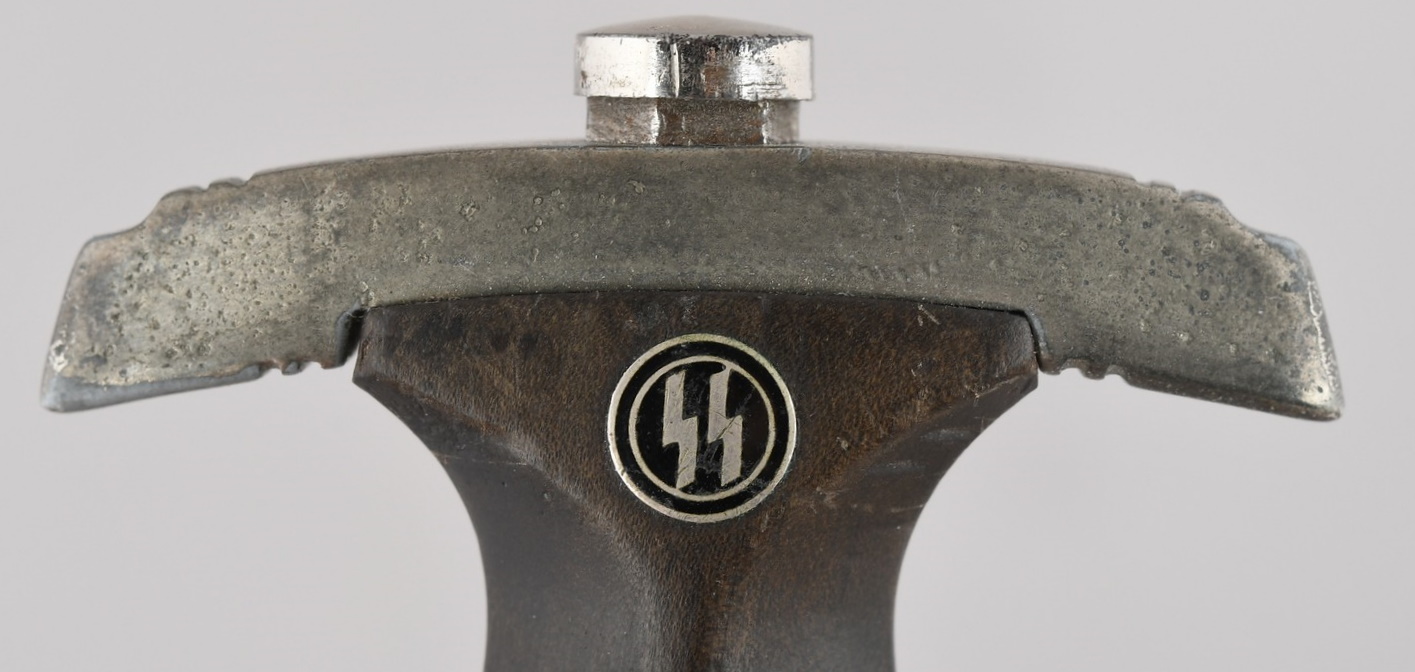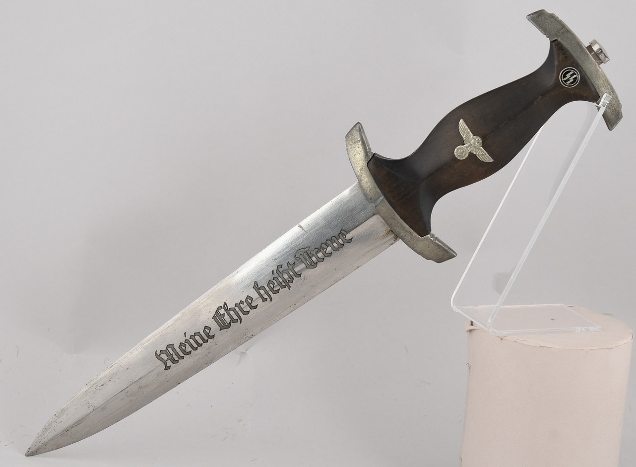 The SS M33 service dagger was introduced on December 15th 1933 for wear by all full SS members, regardless of rank. The dagger was intended as an ornamental item and the design was based on the traditional 16TH century Swiss “Holbein” hunting dagger as was being utilized for the SA personnel’s dagger with a different coloration and insignia. The daggers were bestowed annually to newly accepted SS members at 10:00pm on the anniversary of the unsuccessful Beer Hall Putsch, (November 9TH), in front of the Feldherrnhalle in Munich. Originally the daggers featured an anodized scabbard and utilized nice quality solid nickel/silver fittings until roughly early 1937 when the scabbards began to have a painted finish and cheaper nickel/silver plated fittings replaced the earlier solid nickel/silver fittings in 1938.