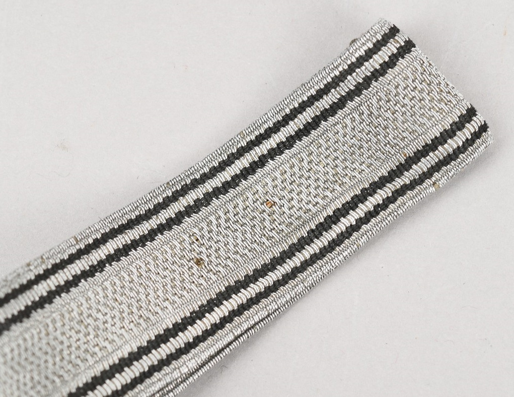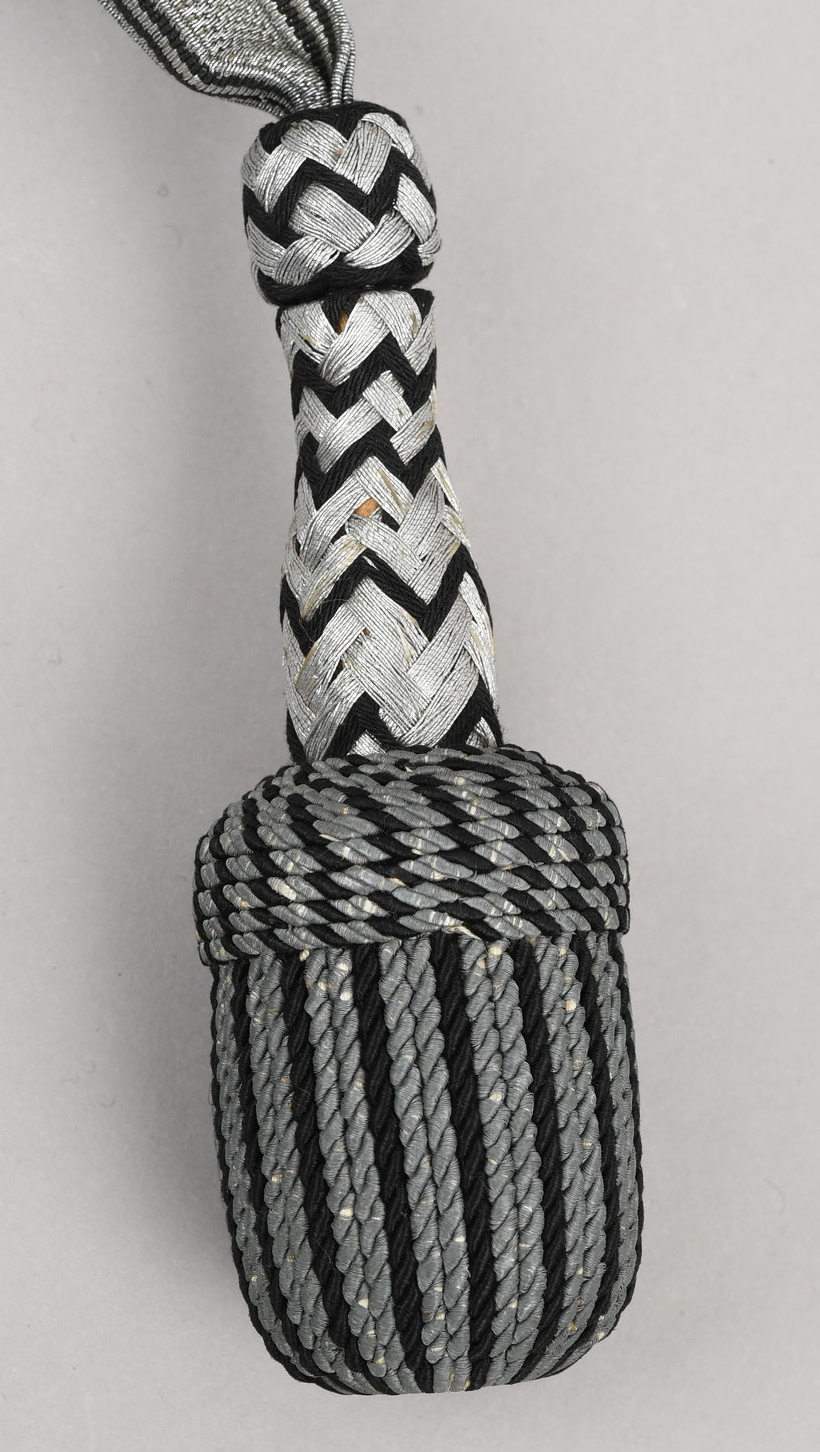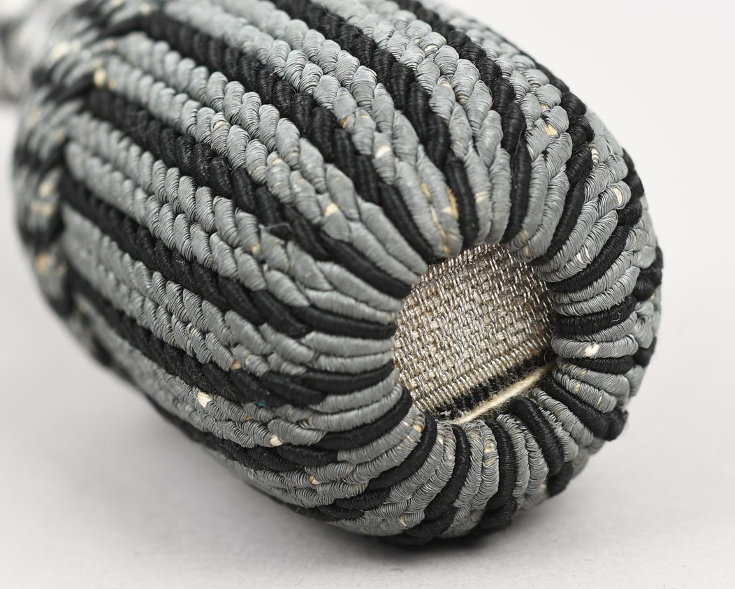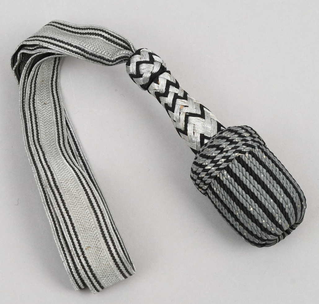 SS NCO’s bayonet portepee, constructed of silvery/aluminum flat and twisted wires, the head in multiple rows of twisted wires, interchanged with black twisted wires, with the center of the head in matching loops of black and silvery embroidery. The stem also embroidered in the same black and silver pattern. In very good condition with a nice age patina.