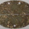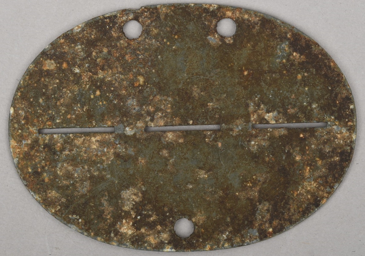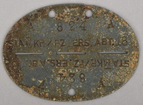 German dog tag (Erkennungsmarke), constructed of alloy metal. Two identical parts ment to be broken to the middle with one part following the body and the other to the unit for report of the death. “The dog tag is marked STAMKP./PZ.ERS.ABT 18” and identifation number marked “824” and “A” for blood group A. Complete example with signs of age.
