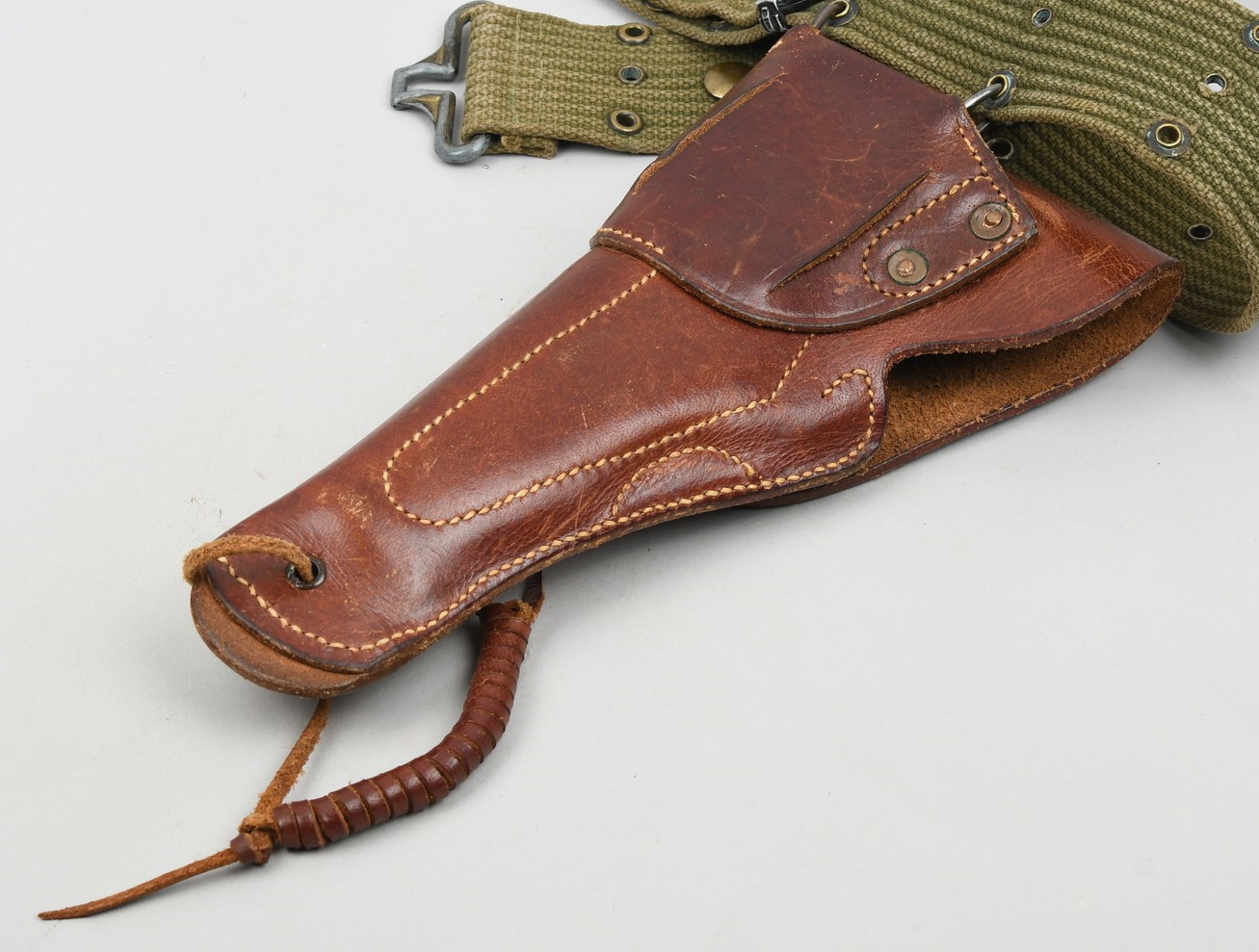 The belt is 5.5cm wide and 110cm long, khaki webbed canvas constructed with blackened eyelets for the easy attachment of various pieces of field equipment, and blackened “T” closure. The belt is in good still used condition with light signs of age and use. The belt comes with a U.S. M1942 field dressing pouch in olive green colored webbed canvas. The belt also comes with a Colt pistol holster. This type of holsters was for the M1911 Colt pistol. Developed in 1916 and remained in production for the US Army all the way to 1945. The holster is produced of brown leather holster with brass fittings. The top fold-over flap has “US” within a horizontal oval embossed to it and single stud hole. Holster, belt and field dressing, all in good condition with light signs of age and use.
