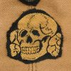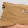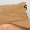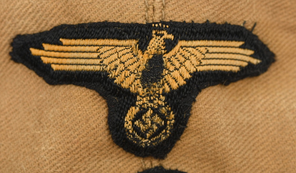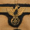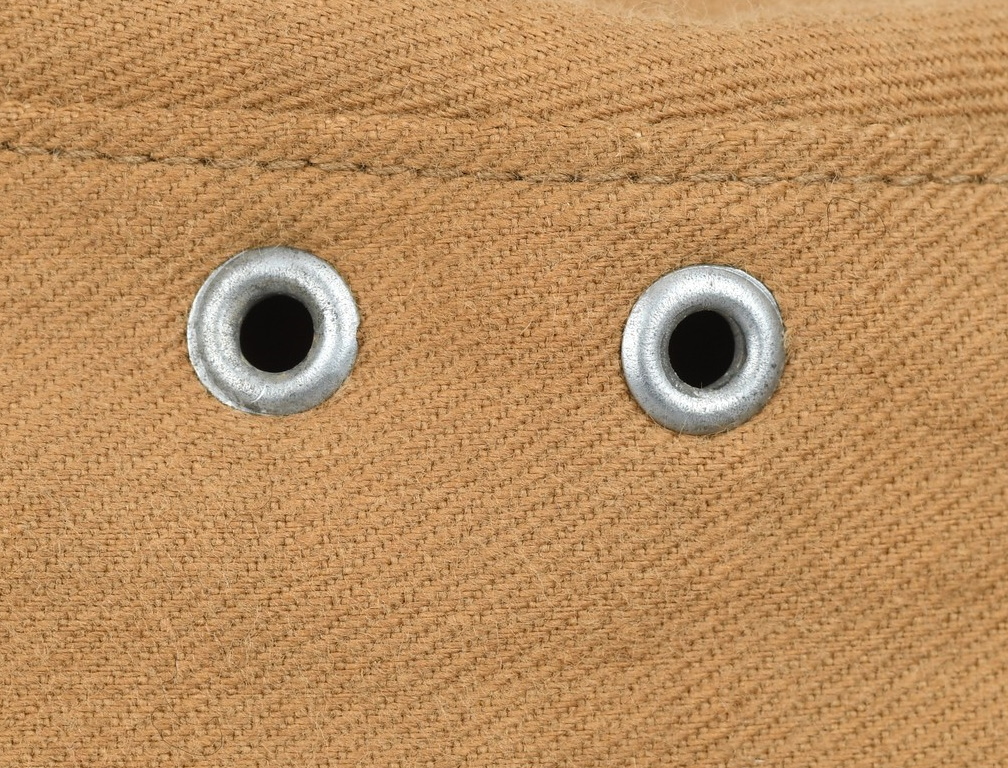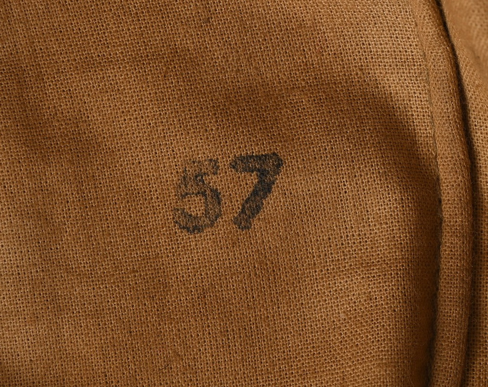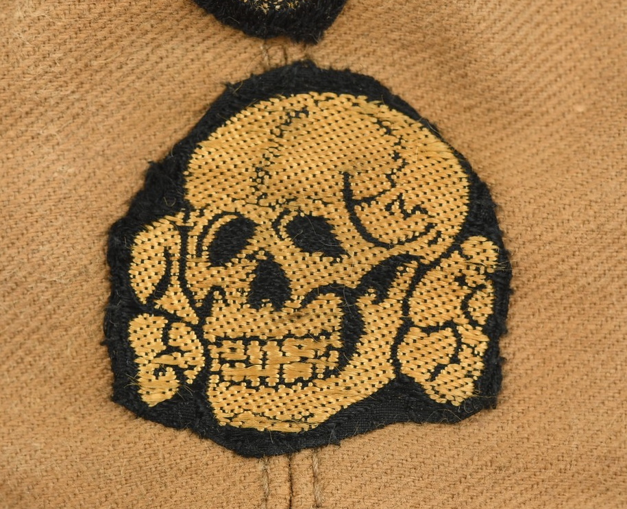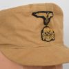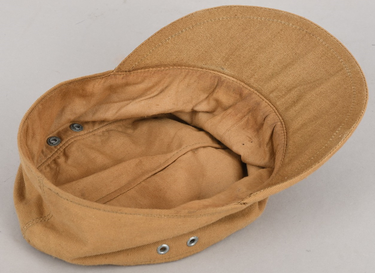 Waffen-SS em/nco’s m41 field cap. The cap is a factory produced example, produced of khaki tan, medium weight linen material. Neatly hand sewn to the front is a tropical EM/NCO’s BEVO produced eagle and skull. The eagle shows wear to to center part. To each side is a pair of heavy air ventilation grommets. The grommets are produced of aluminum with inserts produced of zinc. Inside is lined with light, smooth linen cloth. The lining is clearly size marked “57”. The cap is in good, still used condition.