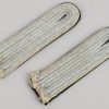 Sew-on shoulder boards of silver/aluminum Russian braid, with white wool piping on a black rayon base. The shoulder boards represent the rank of SS-Untersturmführer serving in a Infantry unit. The matching pair shows clear signs of age and real use.