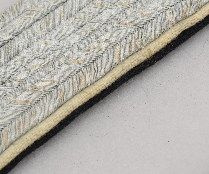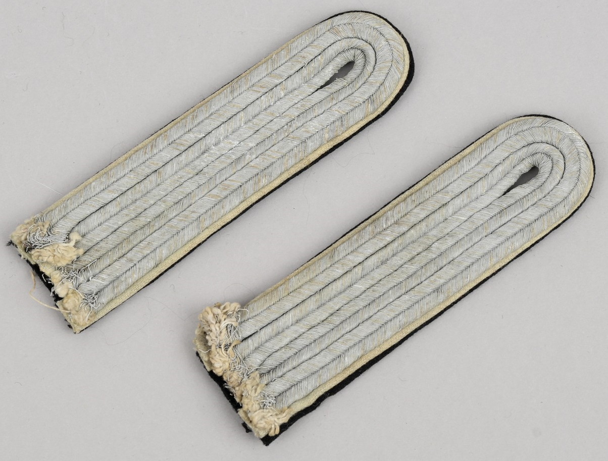 Sew-on shoulder boards of silver/aluminum Russian braid, with white wool piping on a black rayon base. The shoulder boards represent the rank of SS-Untersturmführer serving in a Infantry unit. The matching pair shows clear signs of age and real use.