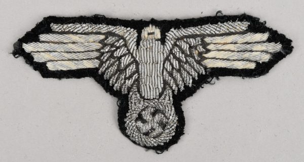 High quality, hand embroidered officer’s sleeve eagle in bright silver/aluminum wire and bullion threads with black accent threads on a cut-out black wool base. The reverse still has its original protective black paper backing intact. The eagle was removed from a jacket and shows clear signs of real use.