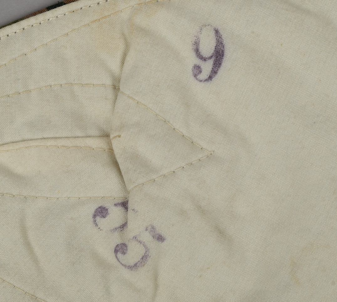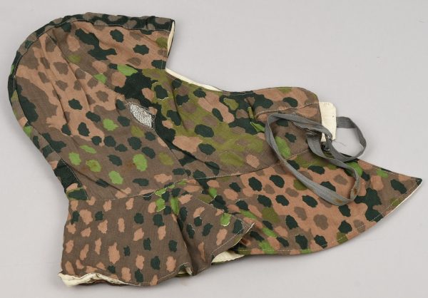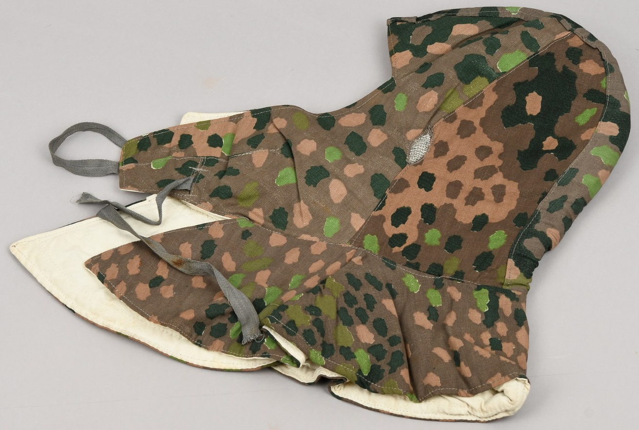 Waffen-SS later war (1944-1945) “Erbsenmuster”. Pea pattern camouflage reversible winter uniform parka hood, which would be worn over the head when the helmet was not required. This hoods were produced in various camouflage and solid color exteriors and were made to match the various German Army winter parkas, trousers and hood garments. The hood features closure ties. It also have earholes which only have the insulation present, not the exterior shell, for better hear that did not leave the ears entirely unprotected. Inside is marked “55” which is the size and “9” which is most likely a factory code. Condition is very good, with minor signs of age.