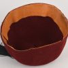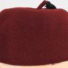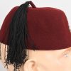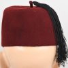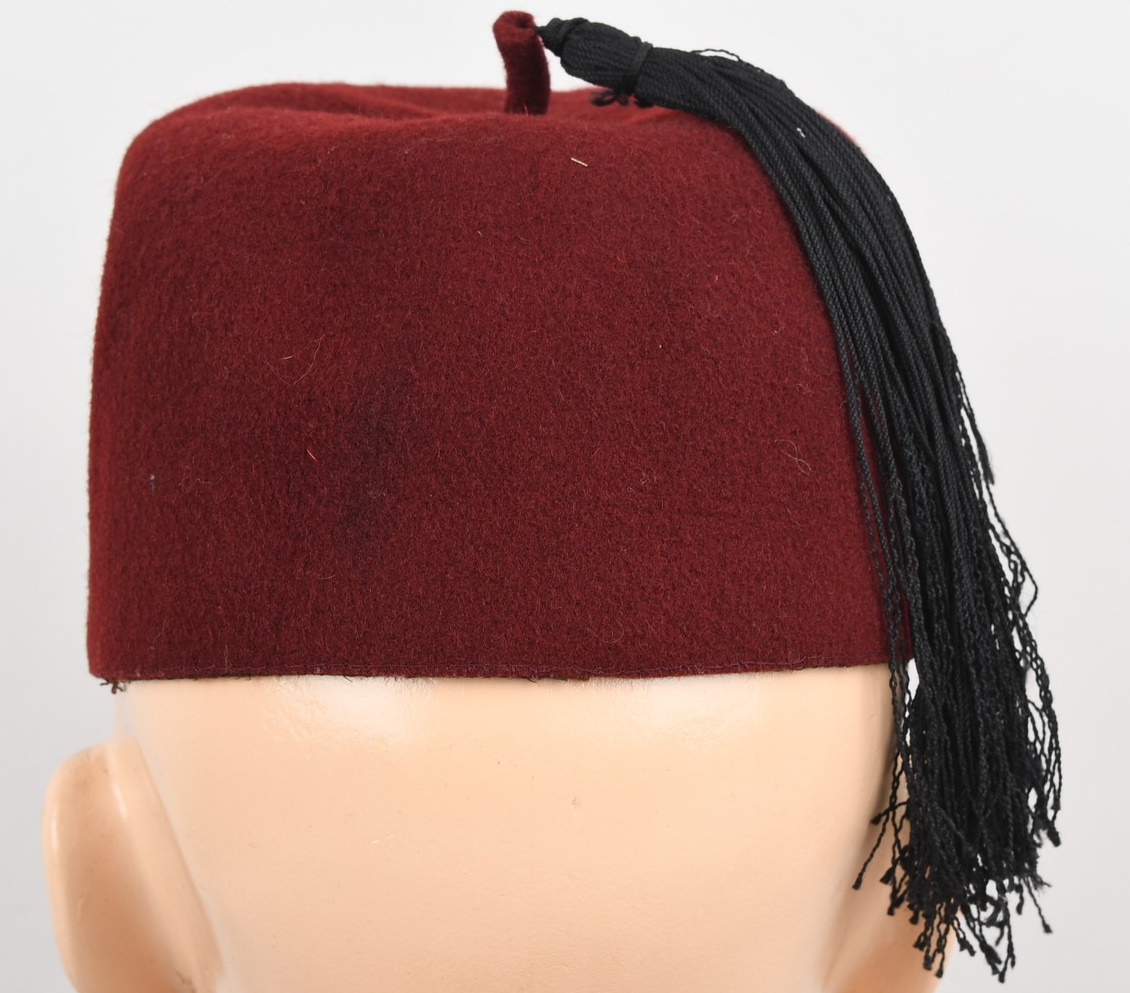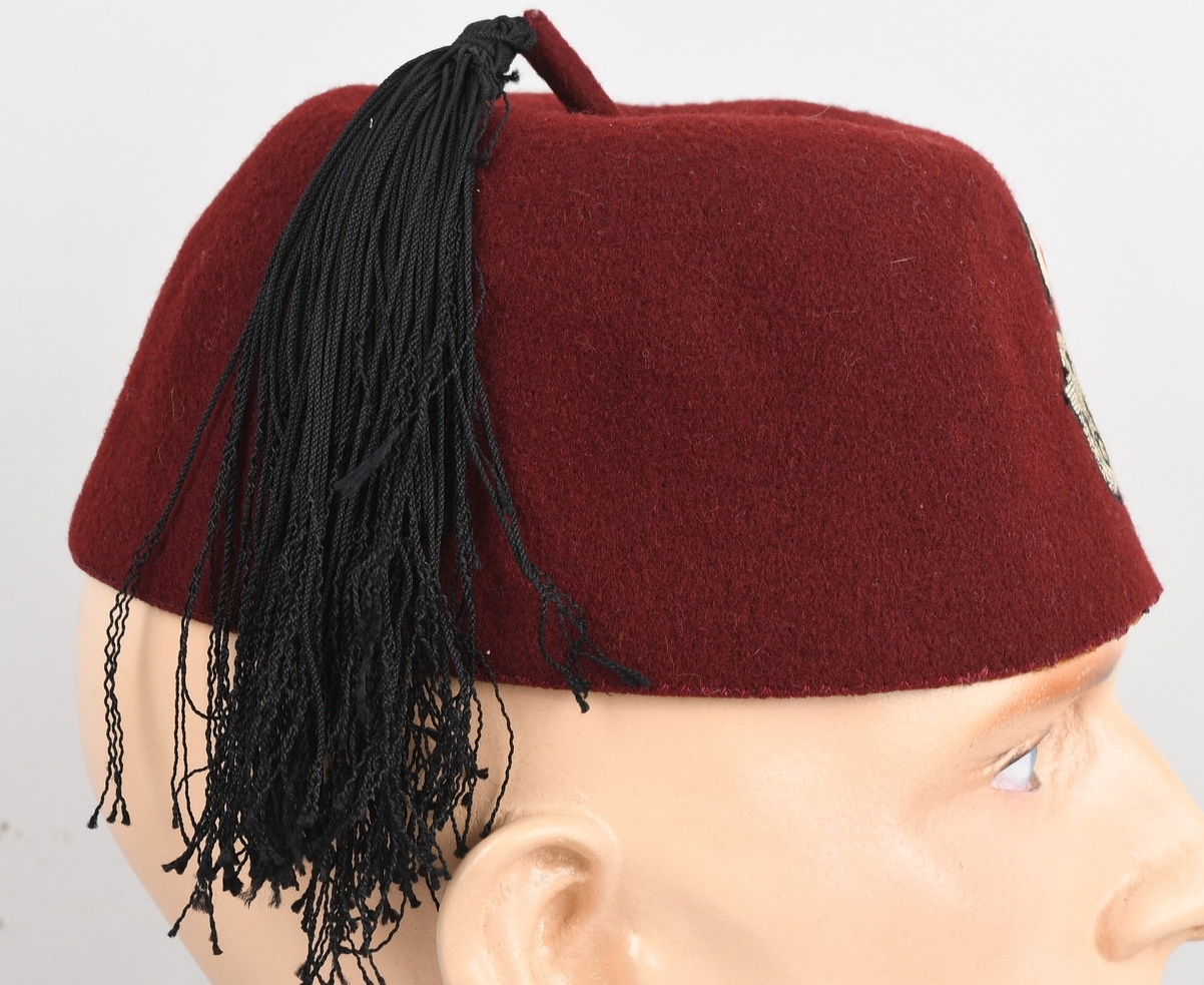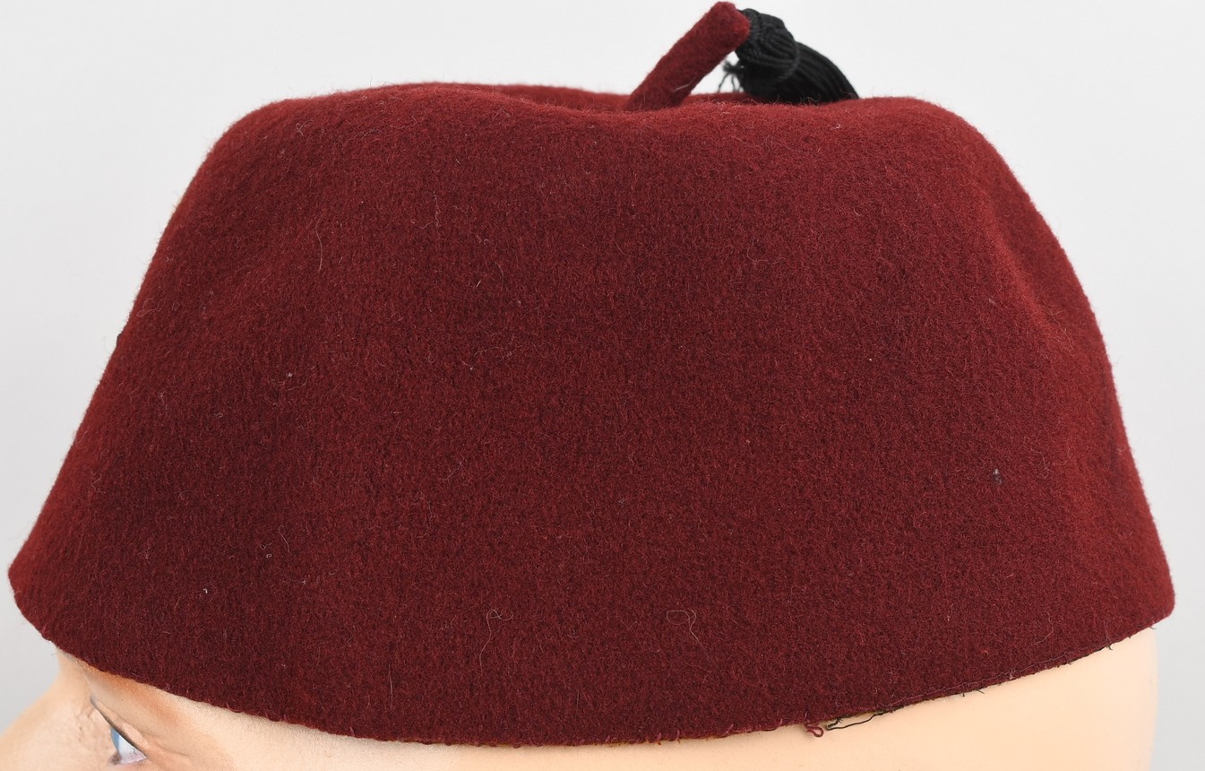 Rabbit fur felt, maroon construction dress uniform fez. The fez features a tassel to the top center of the crown. The tassel has a short piece of maroon felt inserted and stitched into the center with the correct, black, multi-strand, silk type material tassel sewn to the top. To the front of the cap is a national cockade and a second pattern police national insignia machine sewn in place. The unlined interior has a full remaining brown leather sweatband machine stitched to the bottom edge. In good condition with light signs of age and real use.