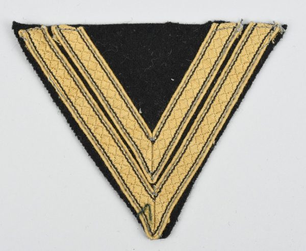 The insignia consists of a doubble “V” shaped, machine woven, diamond patterned, tress chevron in subdued golden/tan rayon with interwoven fine black stripes near both the inner and outer edges. Machine sewn on a black wool base. In very good condition with light signs of age.
