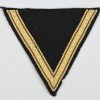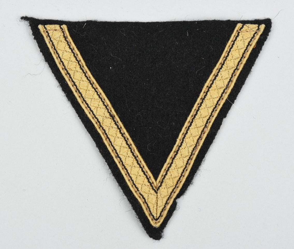 The insignia consists of a single “V” shaped, machine woven, diamond patterned, tress chevron in subdued golden/tan rayon with interwoven fine black stripes near both the inner and outer edges. Machine sewn on a black wool base. In very good condition with light signs of age.