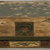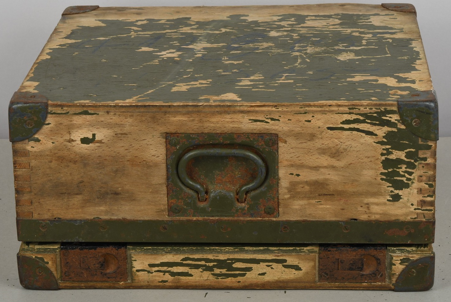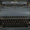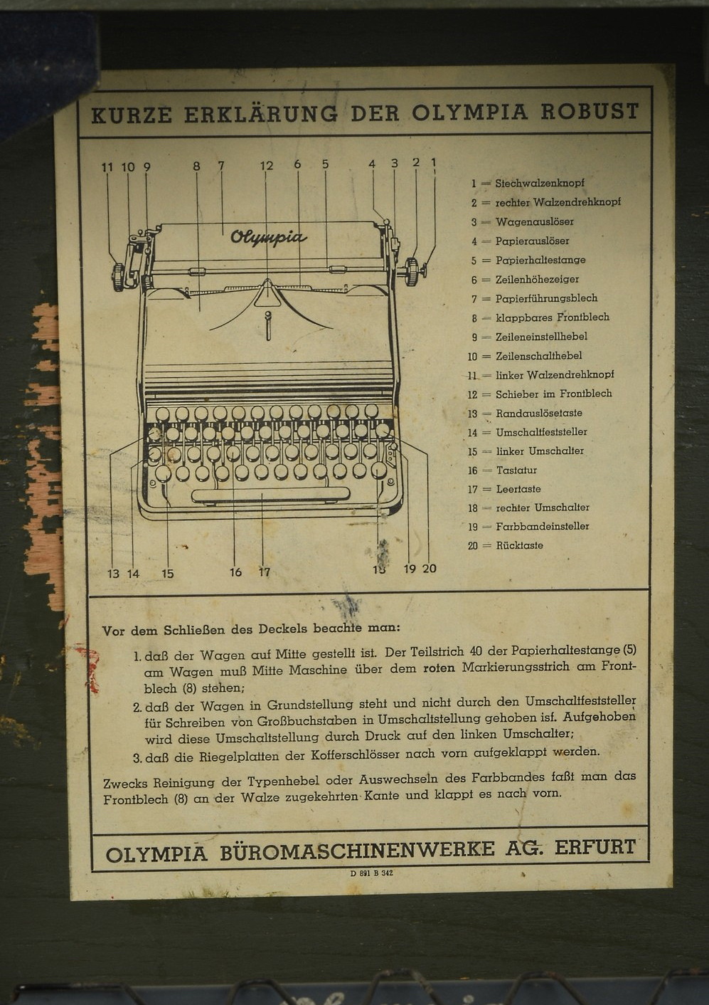 This is a ROBUST model, manufactured by “OLYMPIA BÜROMASCHINENWERKE AG. ERFURT” (Olympia Office Machine Works Co) as noted on the label inside of the transit chest. There is also the script logo Olympia on the typewriter itself. The typewriter seems to be fully functional. The Typewriter comes complete with it’s original wooden military transit chest, with an inner label reading KURZE ERKLÄRUNG DER OLYMPIA ROBUST (Short Explanation of Olympia ROBUST) on the inside of the lid. The machine is in good condition with a age dust build up and for sure needs a good cleaning. Transport case shows some wear and the field-grey paint is mostly worn of and dry.