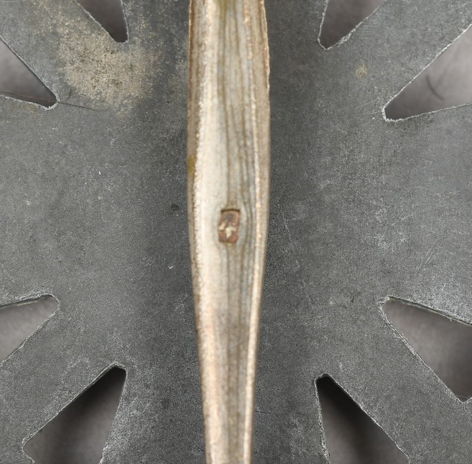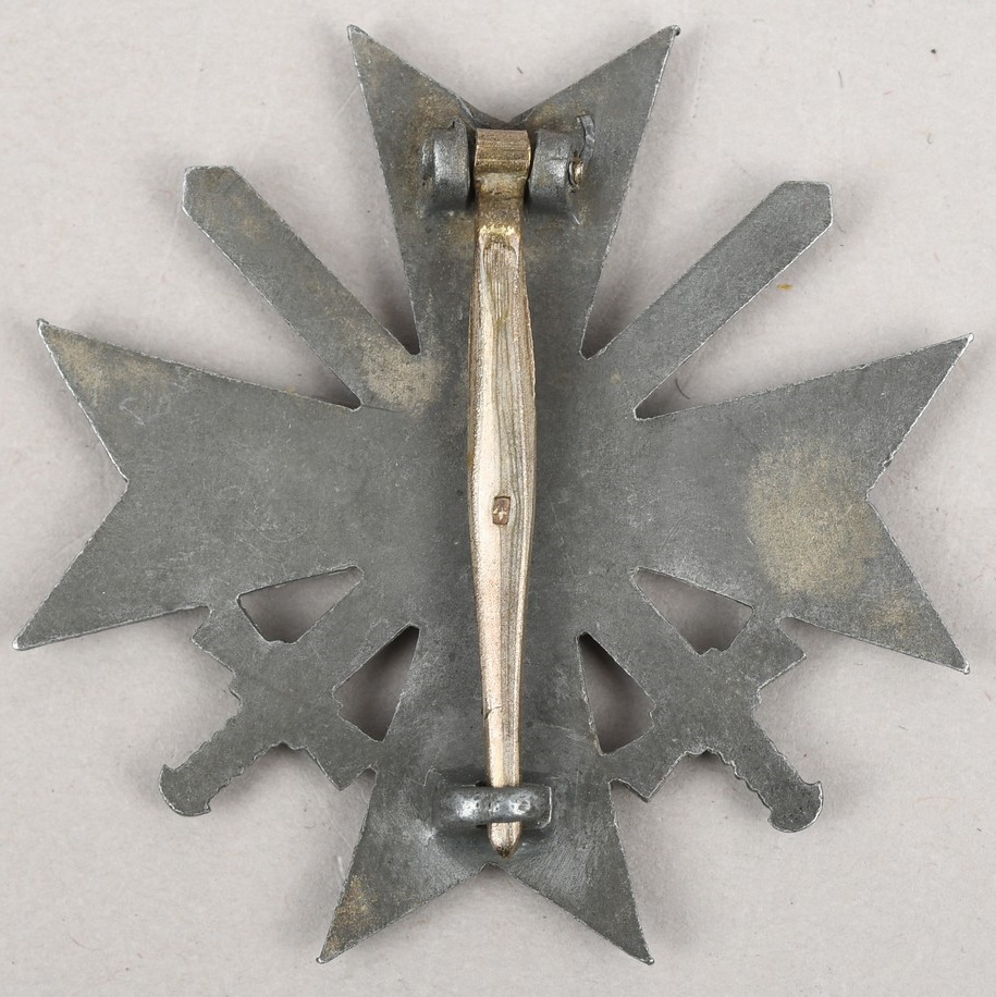 Die struck, zinc construction cross with a silver wash, in the form of a Maltese style cross with a circular centerpiece with an embossed, swastika encircled by an oak-leave wreath. The plain, reverse has the hinge, catch and broad tapered pin all intact. The pin is well marked with the manufacturer’s number “4”, indicating manufacture by Steinhauer & Lück, Lüdenscheid”. The cross is in good condition but has lost it’s original silver paint.