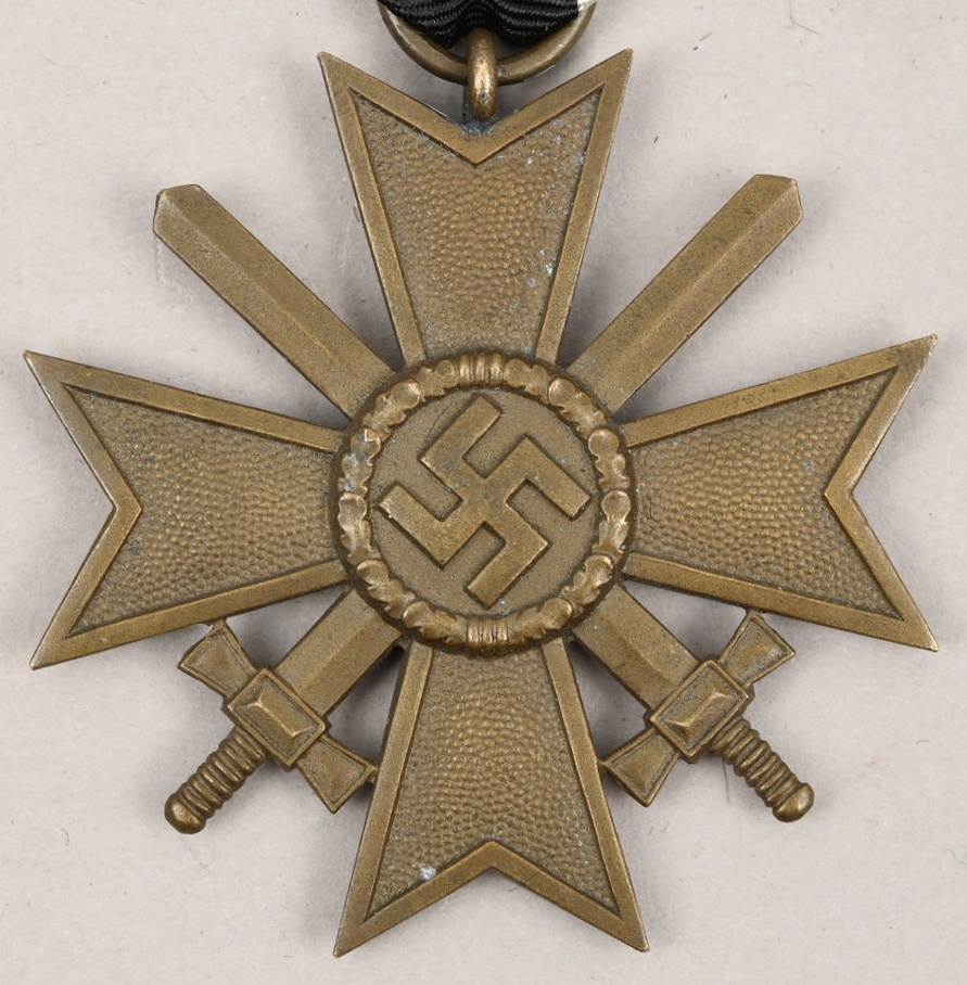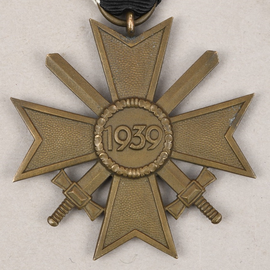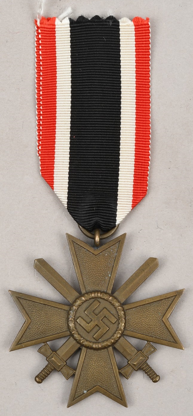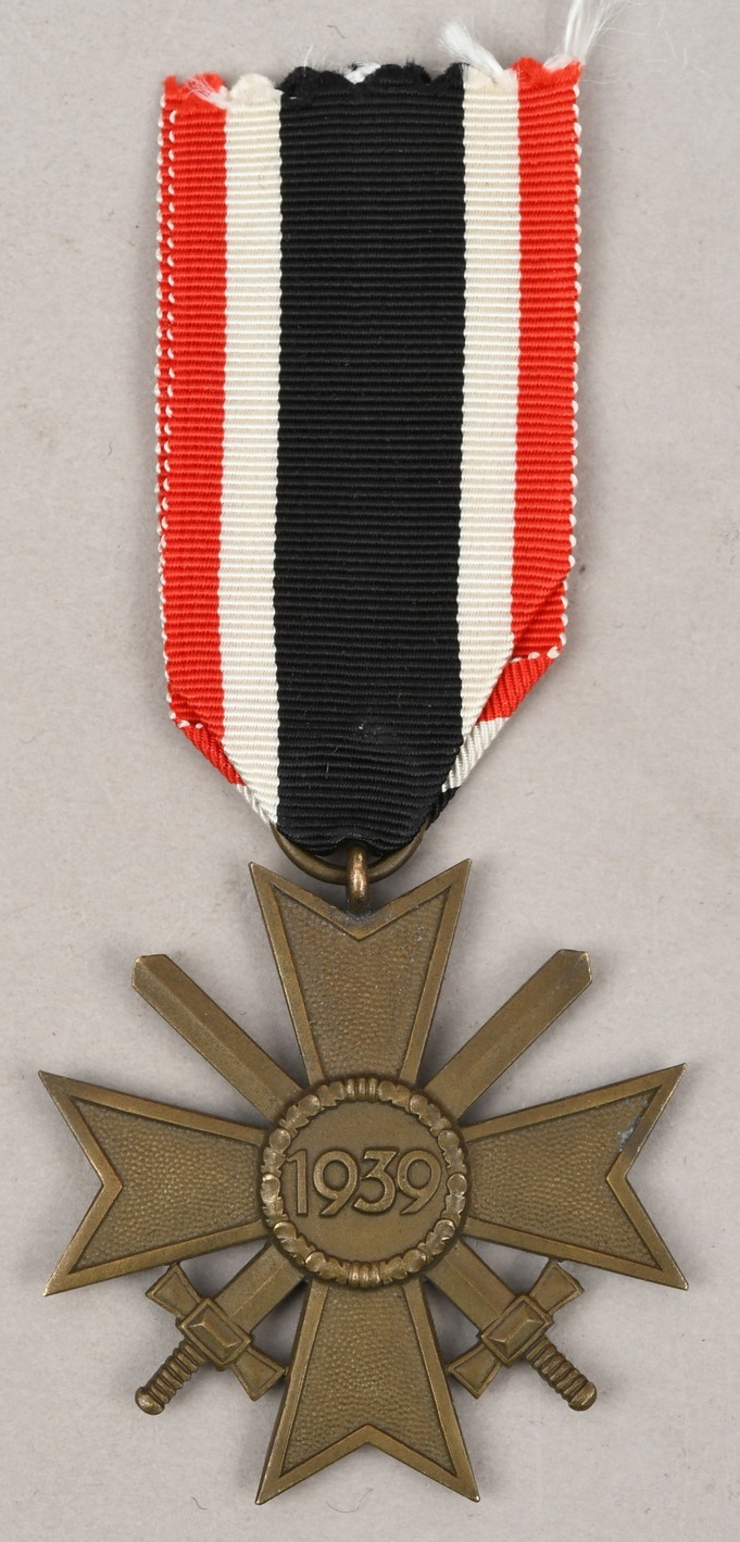 War Merit Cross 2’nd class with swords. High quality example, constructed of Buntmetal with a bronze color wash finish. The medal comes complete with intact suspension ring and correct, long rayon ribbon. The cross is in very good condition with light sigs of age.