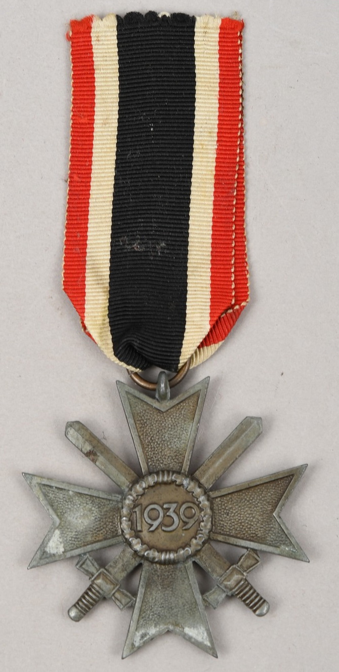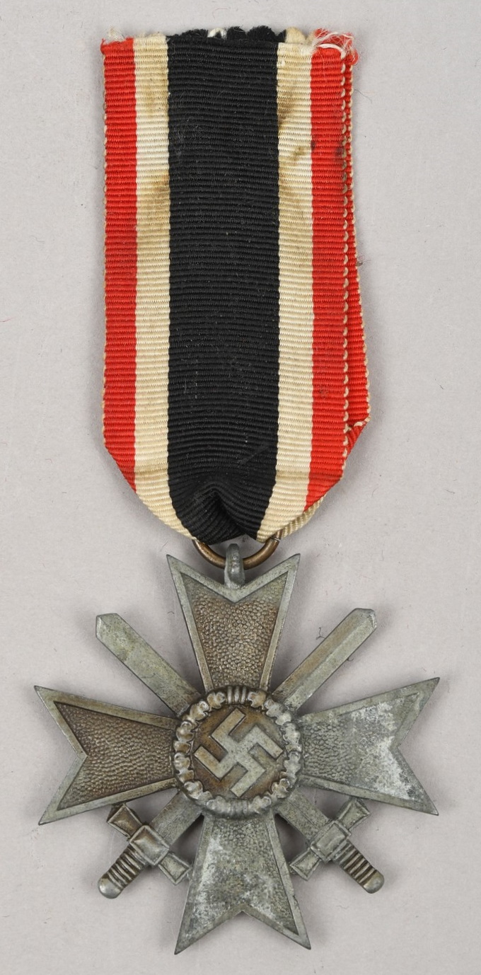 War Merit Cross 2’nd class with swords. High quality example, constructed of Zinc. The medal comes complete with intact suspension ring and correct rayon ribbon. The suspension ring is maker marked “108” for “Arno Wallpach, Salzburg”. The cross has lost it’s bronze color wash and shows some oxidation.