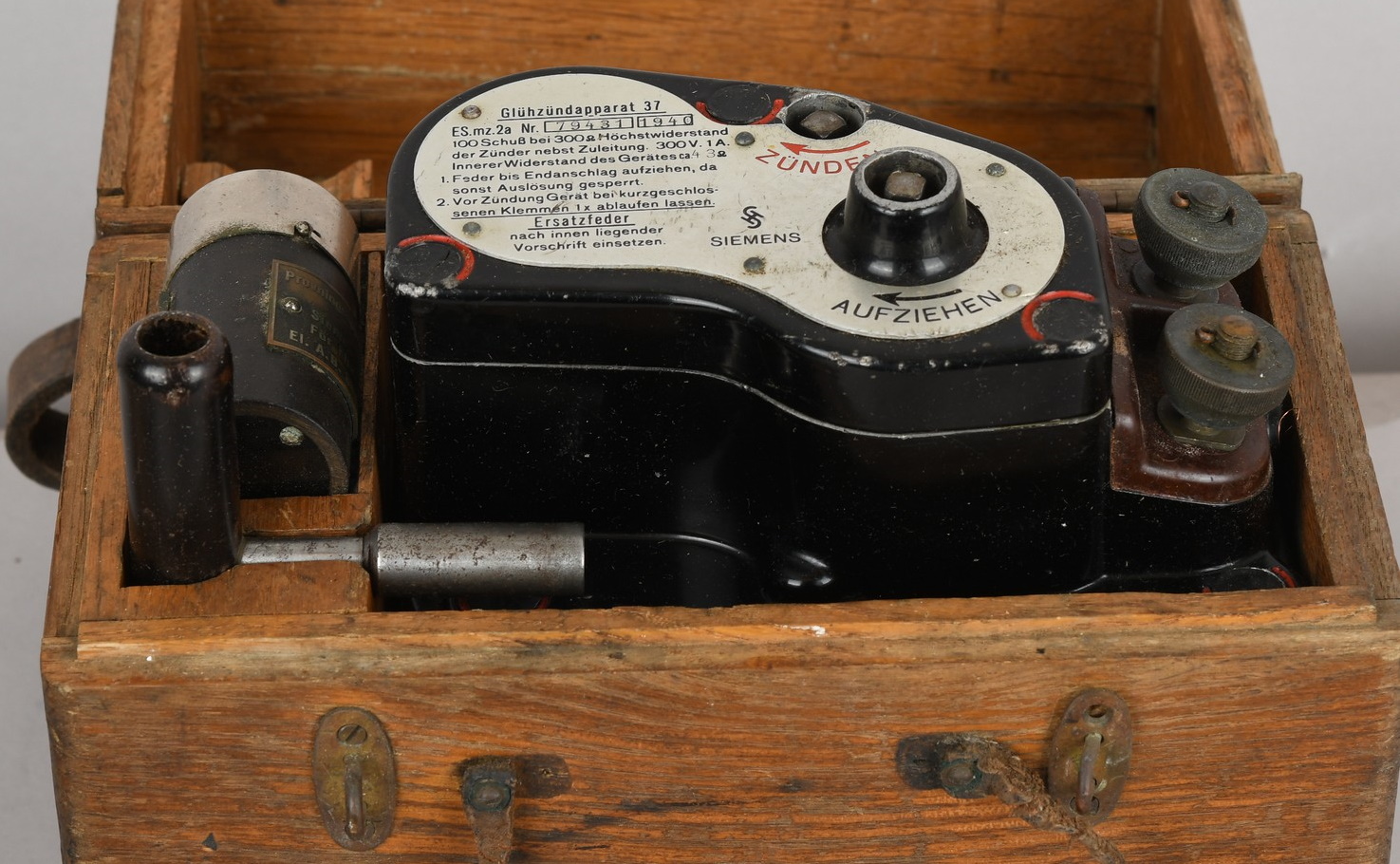 Complete Wehrmacht detonator / blasting machine “Glüzundapparat 37” with electric power tester and blasting key in functional condition. In it’s original factory made wooden box. Constructed by Siemens 1940. All parts included.