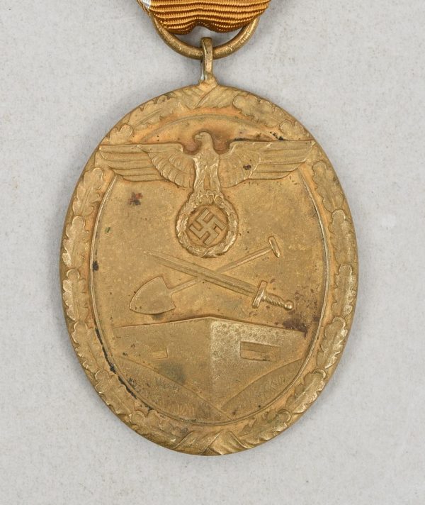 The West Wall Medal was instituted on 2 August 1939 and was awarded to those who designed and built the fortifications on Germany’s western borders, known as the Westwall, the Siegfried Line between 15 June 1938 to 31 March 1939. On 13 November 1939 eligibility was extended to include servicemen of the Wehrmacht who served on the Westwall for at least ten weeks. In all 622,064 medals were awarded until 31 January 1941 when awards of the medal ceased. In 1944 after the allied invasion the medal was re-instituted and awarded to those who renovated and strengthened the fortifications on the western borders. This version of the medal was commonly known as the “Defence Wall Honor Award” to distinguish the decoration from its 1939 counterpart. It was awarded to over 800,000 men in total by the end of the war.
