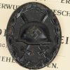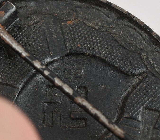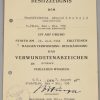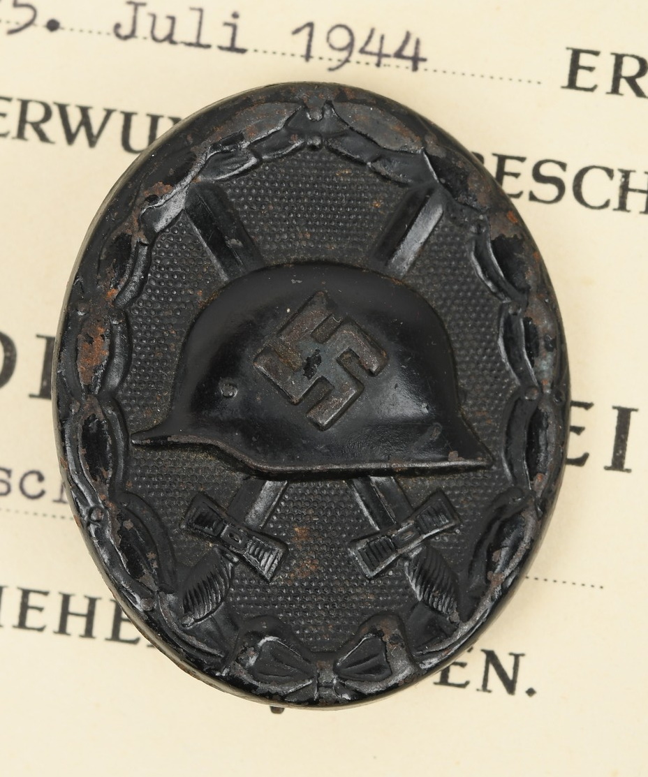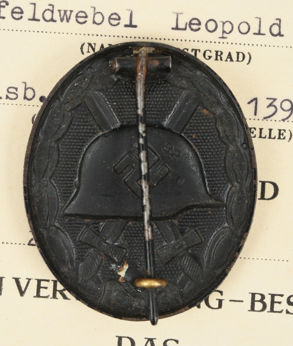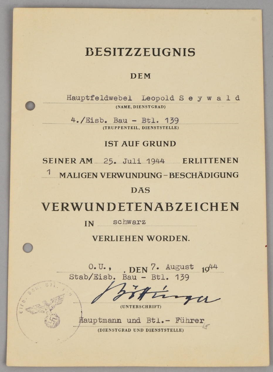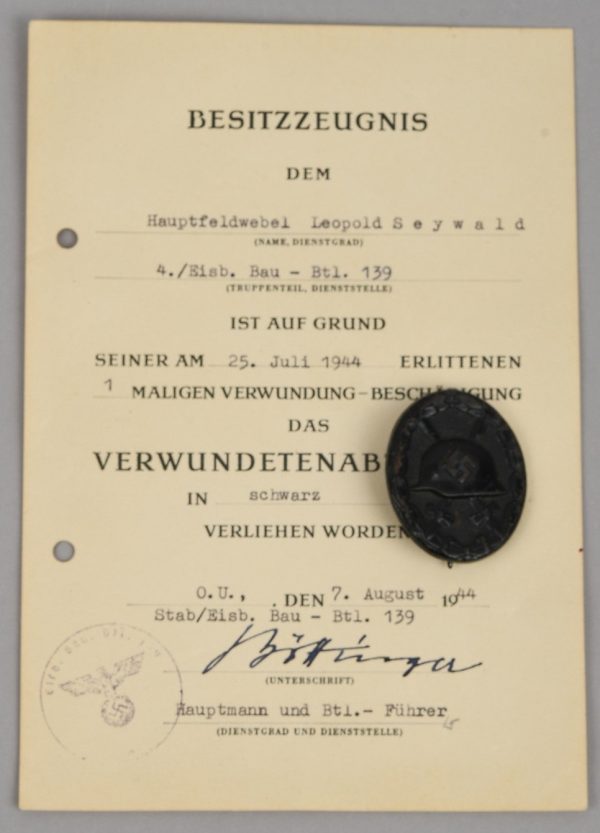 Complete set with award document dated 7 August 1944. Awarded to Hauptfeldwebel Leopold Seywald, serving in 4./Eisb Bau-Btl 139. Document is signed by the Btl leader, a Captain. In very good conditon with minor signs of age with two binder holes. The document comes with the actuall wound badge. The badge is constructed of ferrous metal with a black paint wash. Maker marked to the reverse in high relief: “32” for “Wilhelm Hobacher” (a rare maker to find!). The badge is complete with hinge, pin and catch. The badge shows signs of age and real use, most of the original black paint is still intact and the badge shows some light surface rust.