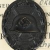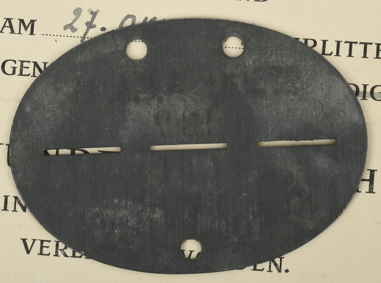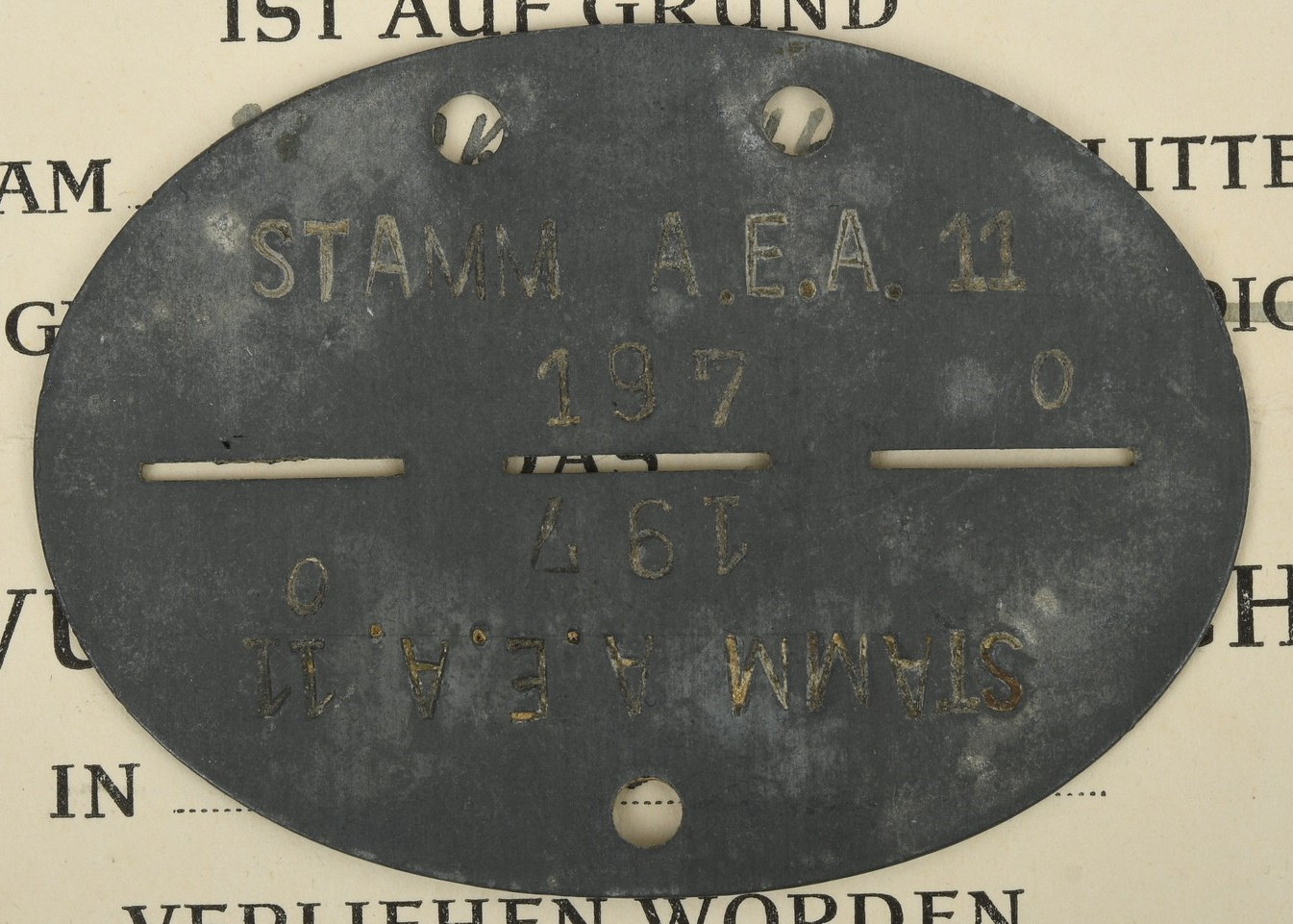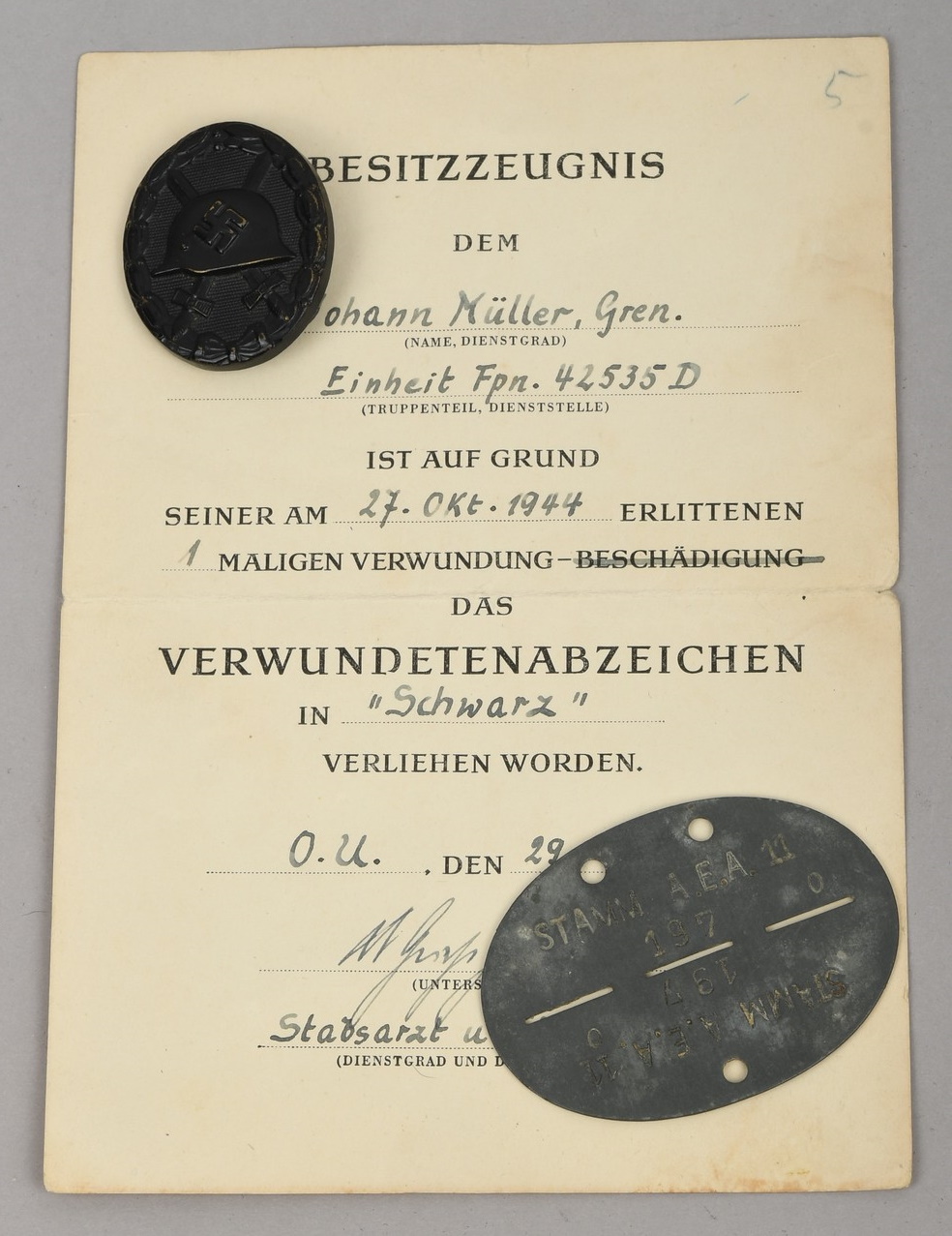 Complete set with award document dated 27 October 1944. Awarded to Johann Müller, serving in grenadier rgt 735. Document is signed by a doctor. In very good conditon with minor signs of age. The document comes with the actuall wound badge. The badge is constructed of non ferrous metal with a black paint wash. The badge is complete with hinge, pin and catch. The badge shows minor signs of age and use, most of the original black paint is still intact. Also included is Müllers complete dog tag produced of Zinc and well stamped “STAMM A.E.A 11”.