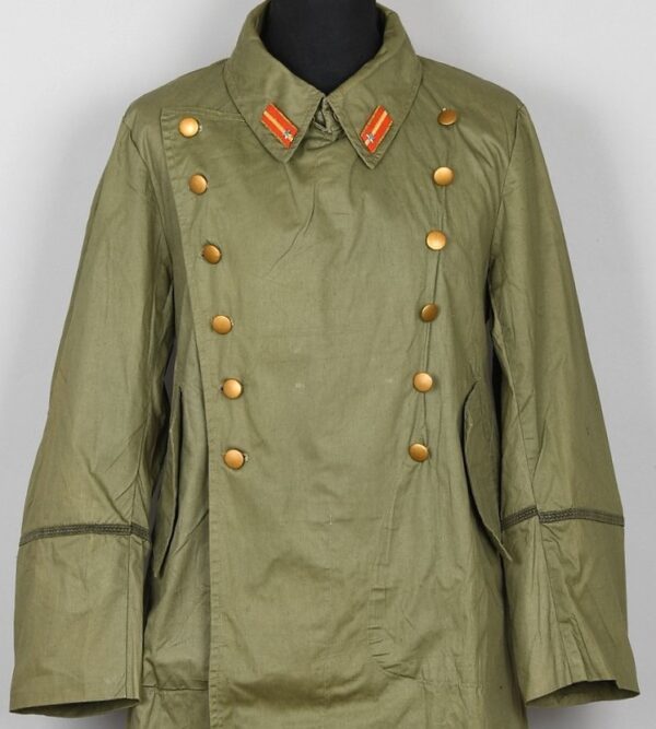 A cotton-made water resistant greatcoat for an 2nd Army Leutnant. As is obvious in the presence of the side slit, it is especially made for a sword-bearer This particular example is sporting a pair of 2nd Lieutenant’s collar tabs and factory-applied sleeve bands. It’s in absolutely unworn condition and without even a storage wear. All bronzed color alloy buttons still intact. No rips, holes or mendings just minor signs of storage wear.