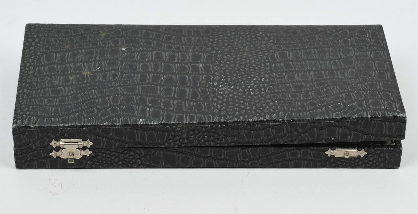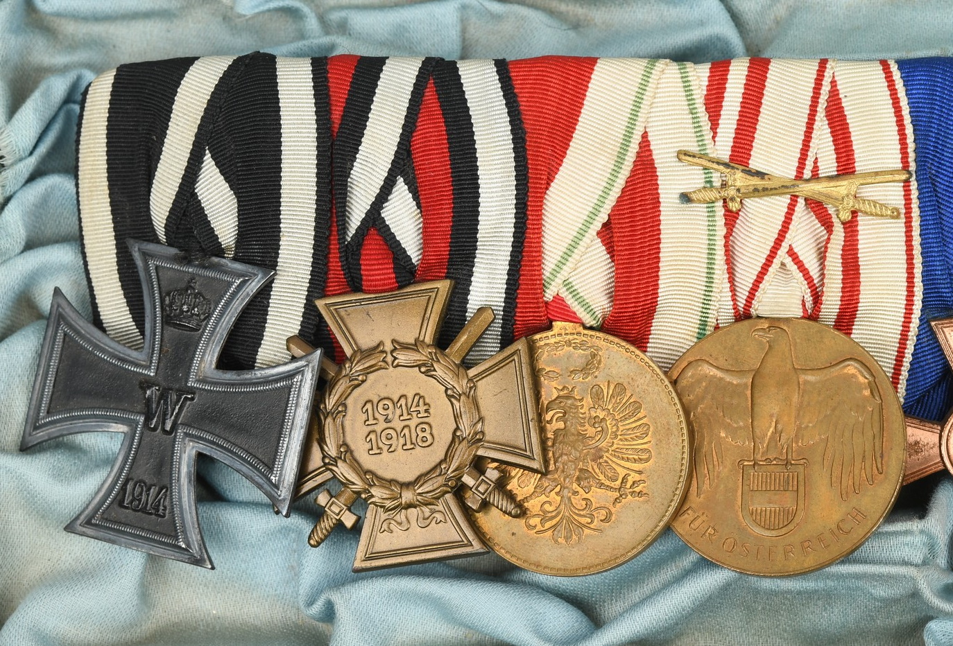 Impressive 7 place medal bar with following medals from left to right: Iron Cross Second Class 1914, Combatants Cross of Honor 1914/1918, Tirol Commemorative Medal 1914-1918, Austrian 1914-1918 Combatants Commemorative Service Medal, Imperial Prussian Long Service Cross for 15 years, Twenty-Five Year Faithful Service Cross, and 1914/18 Hungarian Combatant’s Commemorative Service medal. All medals are mounted with their correct ribbons to a metal plate. The plate has light blue cloth backing to the reverse and intact fastening device. A metal name label is pinned in place to the reverse. It reads: “Hans Hillmann Erfurt 3 Paulstr 3.” The Medal bar comes housed it a watch case. The medal bar rests perfect inside it, almost like it was produced to store the medals. The case is constructed of wood with faux leather imitation cover in black. One of the two closure devices is missing. Besides that, in very good condition. The medal bar is in very good condition with only light signs of age.