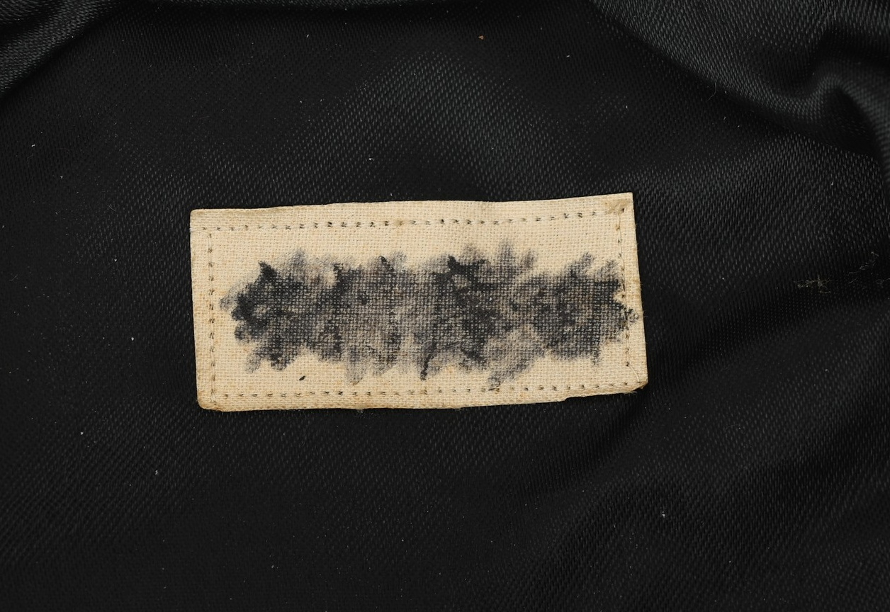 are not able to know the owner’s name because the name tag on the lining is blacked out. Veteran families often do not want the name of the soldier known when they part with the veteran’s belongings. In every way, the hat is clean and pristine. No moth holes at all. just some light moth tracking. The visor has minor superficial damage on the black lacquer finish. Despite the shortcoming, the cap is definitely one of the finest on the market.