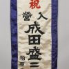 Below the army star symbol, there is a red kanji meaning “celebration” (祝) and a black kanji “enrollment” (入営.) The four large kanji letter vertically lined from top to bottom is the name of the recruit “Mr. Seizo Narita” (成田盛三君) and smaller four kanji letters are the name of the person who dedicated this banner to the recruit: “Yukio Kashiwabara” (柏原幸生).