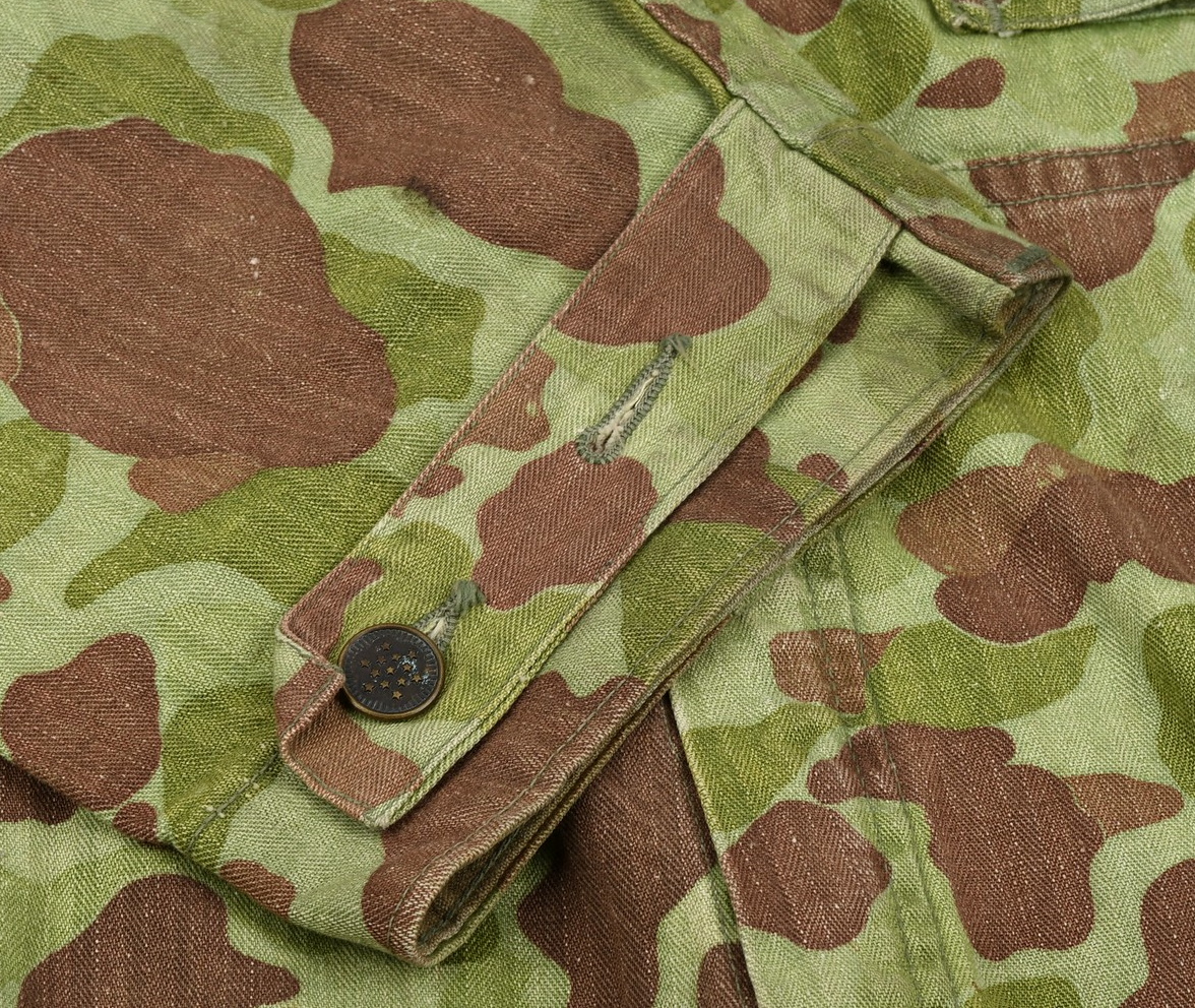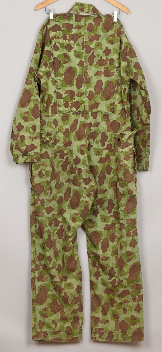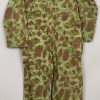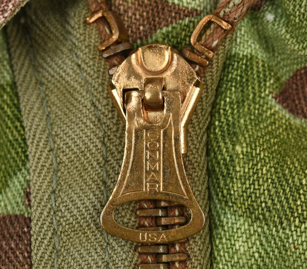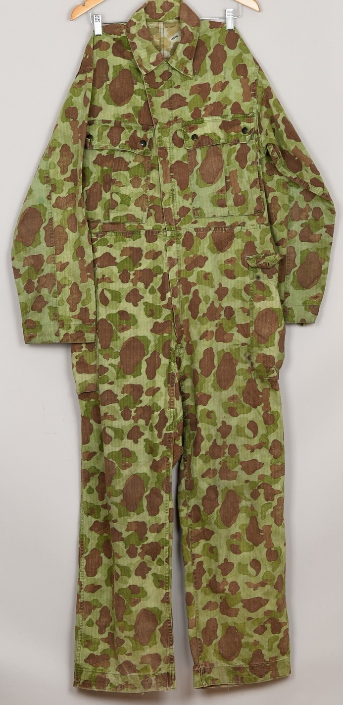 Nicked named “frogskin” camouflage pattern and the very first to be issued to US troops during World War II. These one-piece suits were procured by the Army but as is the case with many uniform and equipment pieces, they were also occasionally worn by US Marines. Predominantly, these were used in the Pacific Theatre, however, there are reportedly some word-of-mouth accounts from veterans that a small handful of GIs wore them in the European Theatre also. The 100% cotton HBT fabric is reversible (green for verdant terrain, tan/brown for beach landings, etc.), however, the suit is designed to be worn green side out. Inside is stamped with size “40r” in black ink.