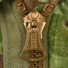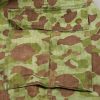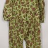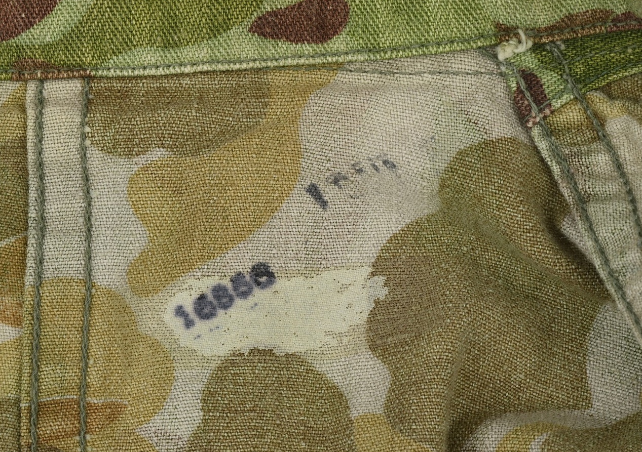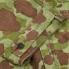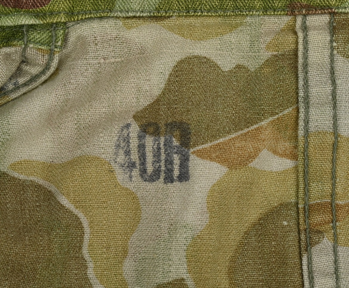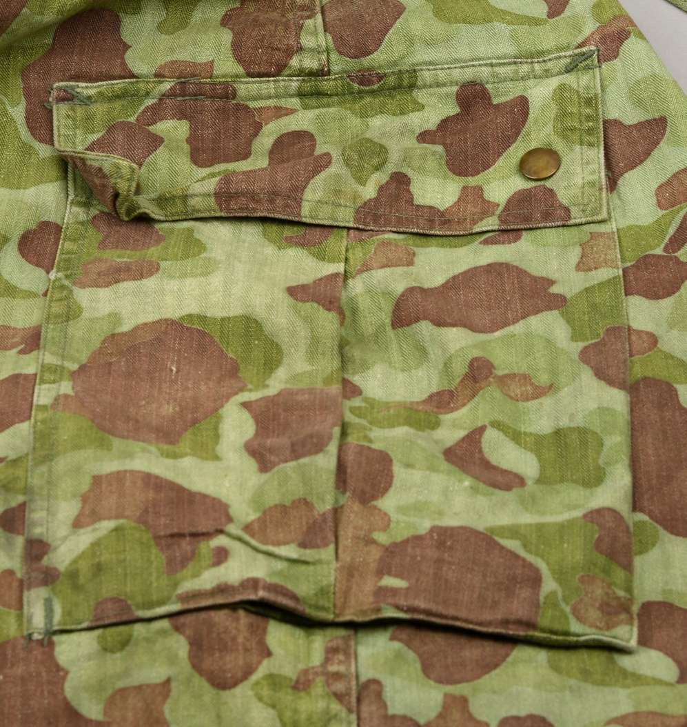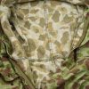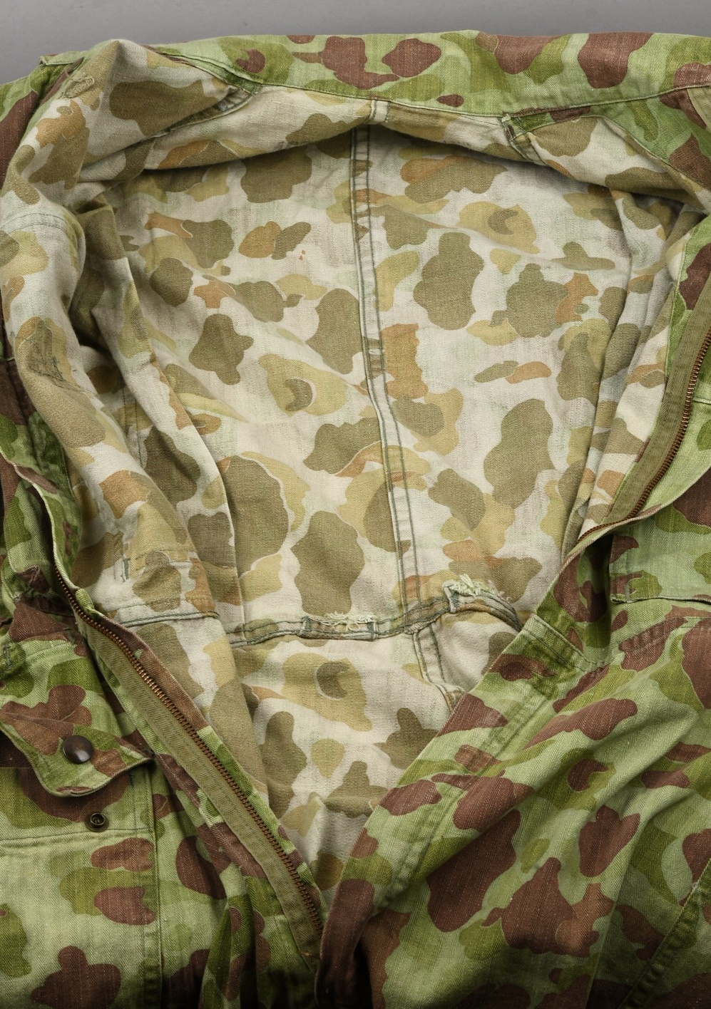 Nicked named “frogskin” camouflage pattern and the very first to be issued to US troops during World War II. These one-piece suits were procured by the Army but as is the case with many uniform and equipment pieces, they were also occasionally worn by US Marines. Predominantly, these were used in the Pacific Theatre, however, there are reportedly some word-of-mouth accounts from veterans that a small handful of GIs wore them in the European Theatre also. The 100% cotton HBT fabric is reversible (green for verdant terrain, tan/brown for beach landings, etc.), however, the suit is designed to be worn green side out. Inside is stamped with size “40r” in black ink.