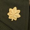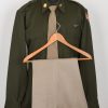 WWII service shirt, constructed of olive green wool. Miniature period pilot wings, maker marked and also marked “sterling”. The wings are pinned in place over the left chest pocket. Pinned in place to the collar is a Colonel’s rank badge and to the left collar is a US 8 air force wing insignia pinned in place. To the left upper sleeve is a USAAF insignia machine sewn in place. To the inside neck is the original manufacturing label still in place. The shirt comes with a pair of war time trousers. Also included is a period tie and belt and buckle. All is in very good condition with minor signs of age.