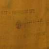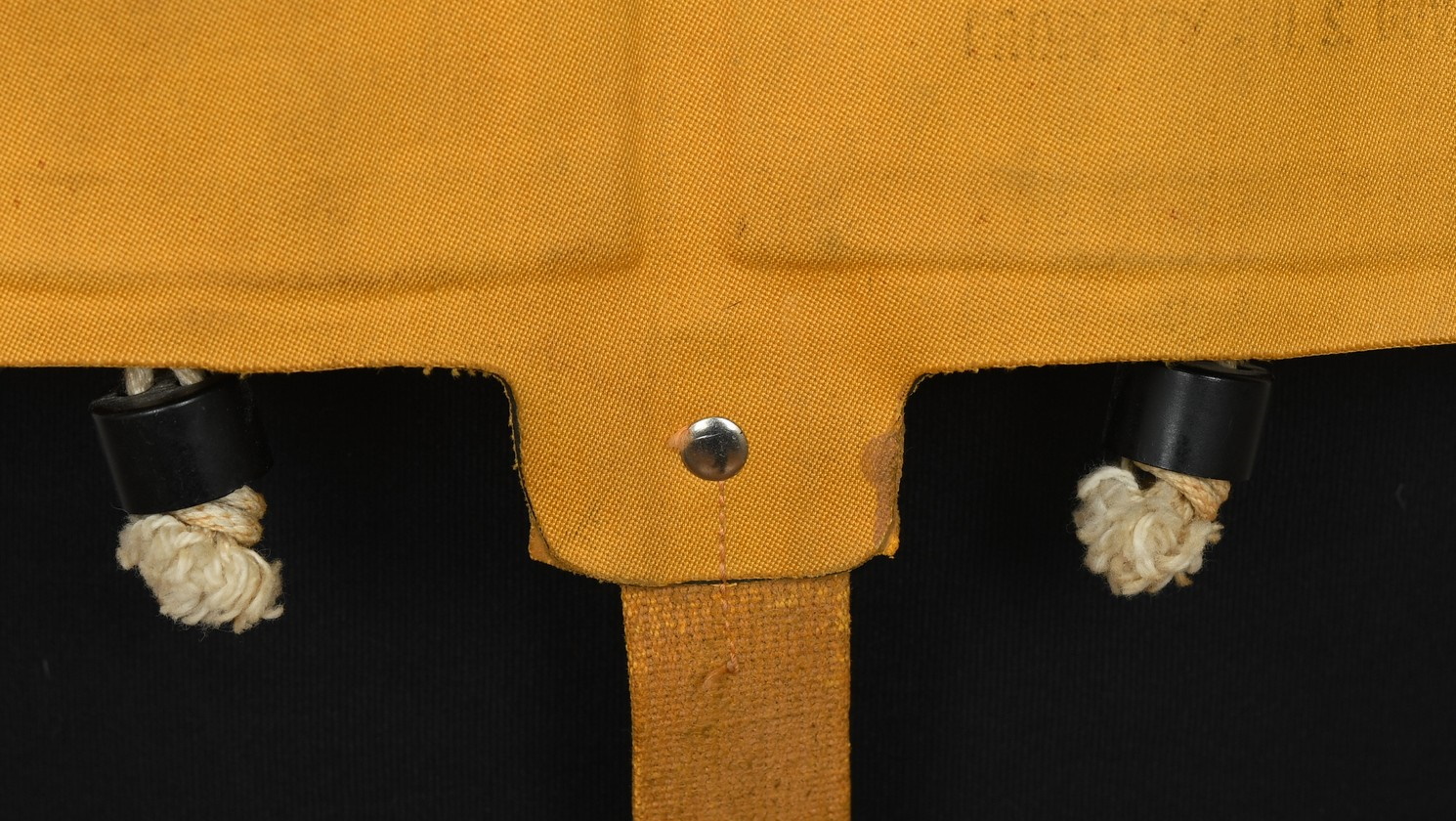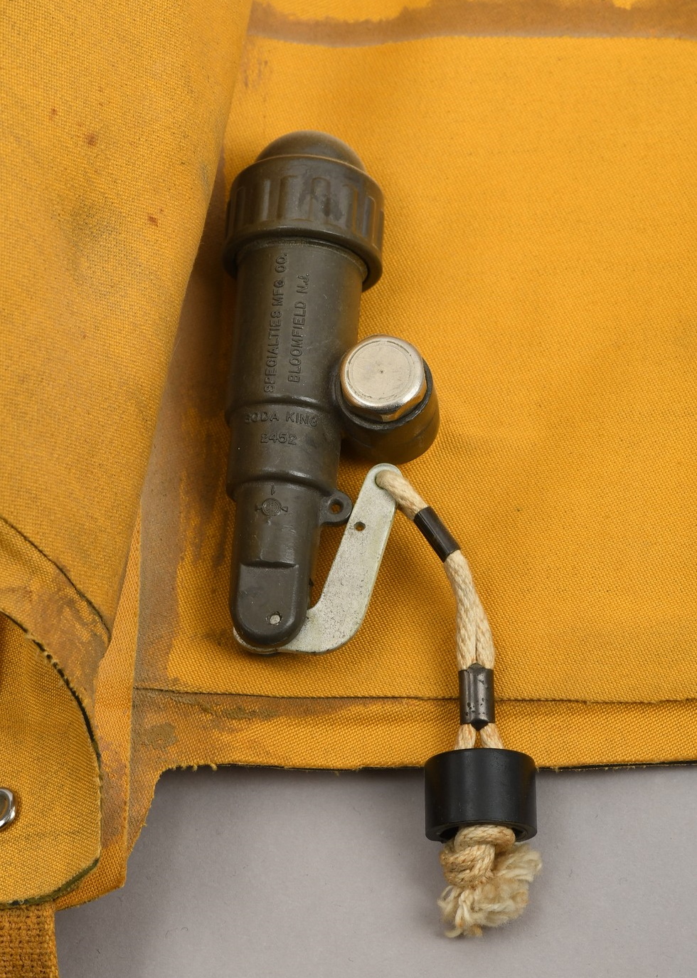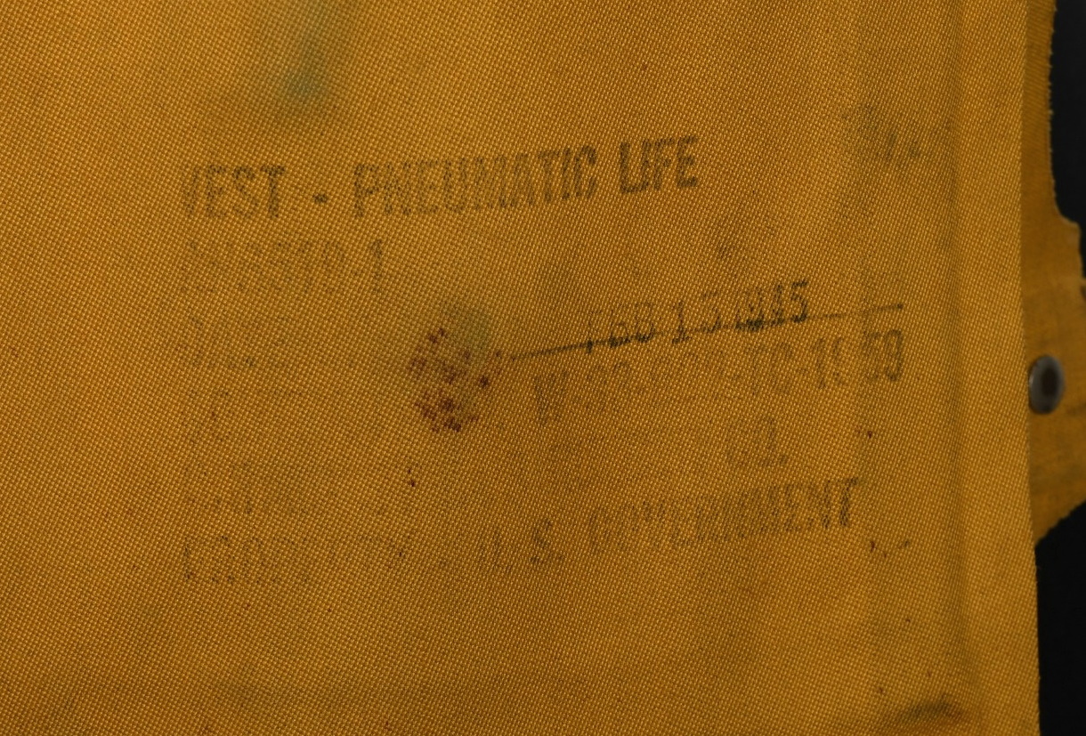 A cotton and latex rubber pneumatic life vest with adjustable straps that wrap around the waist and pass through the legs. It can be inflated by Co2 cylinders that are present to the bottom of each side that are activated by pulling the white cord. The life vest is marked “AN6519″, date of manufacture: Feb 15, 1945″, Property U.S. Government.” In very good condition with light signs of age.
