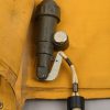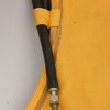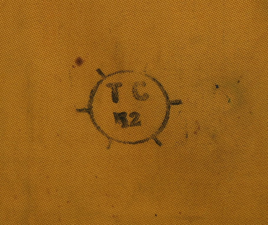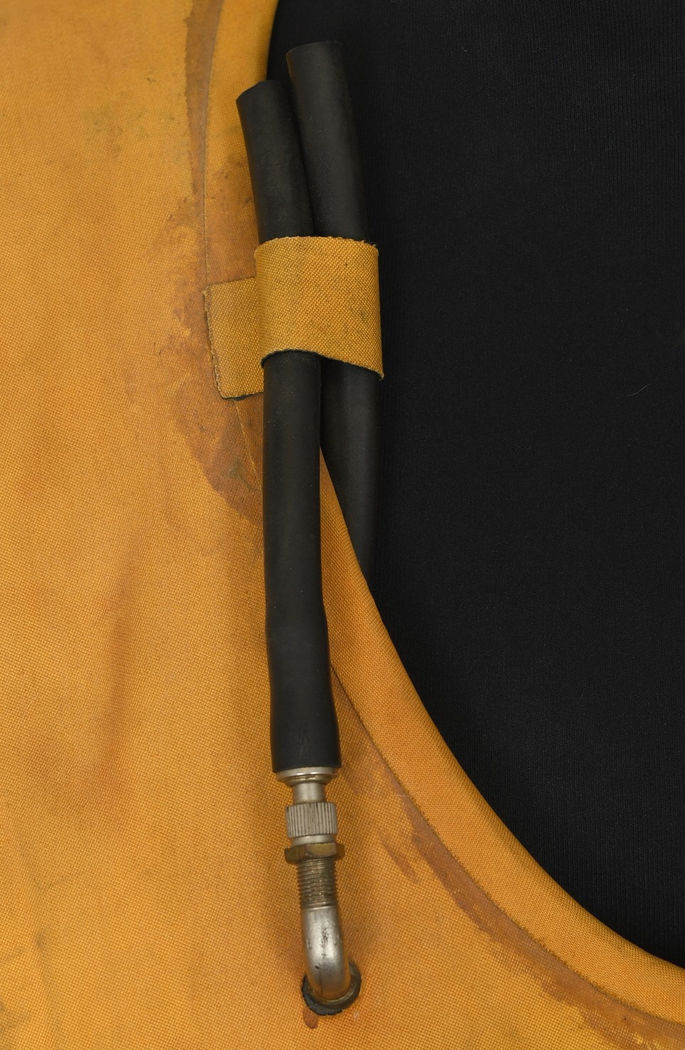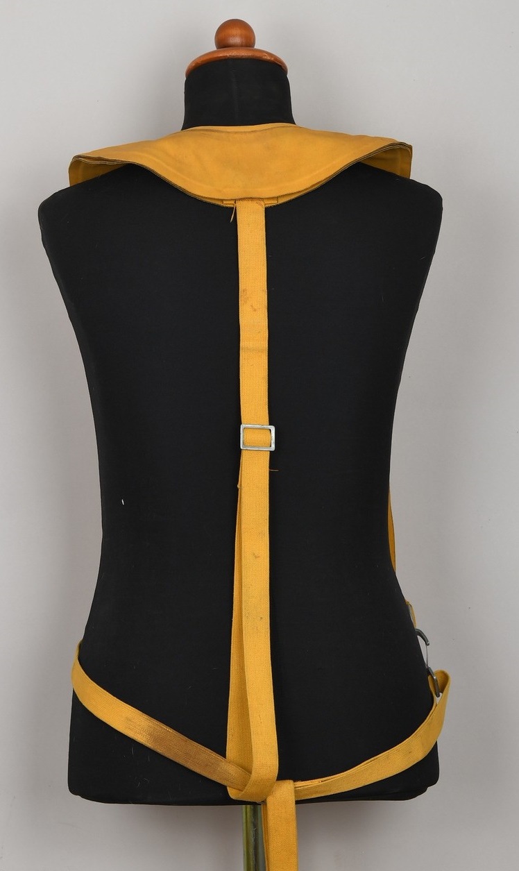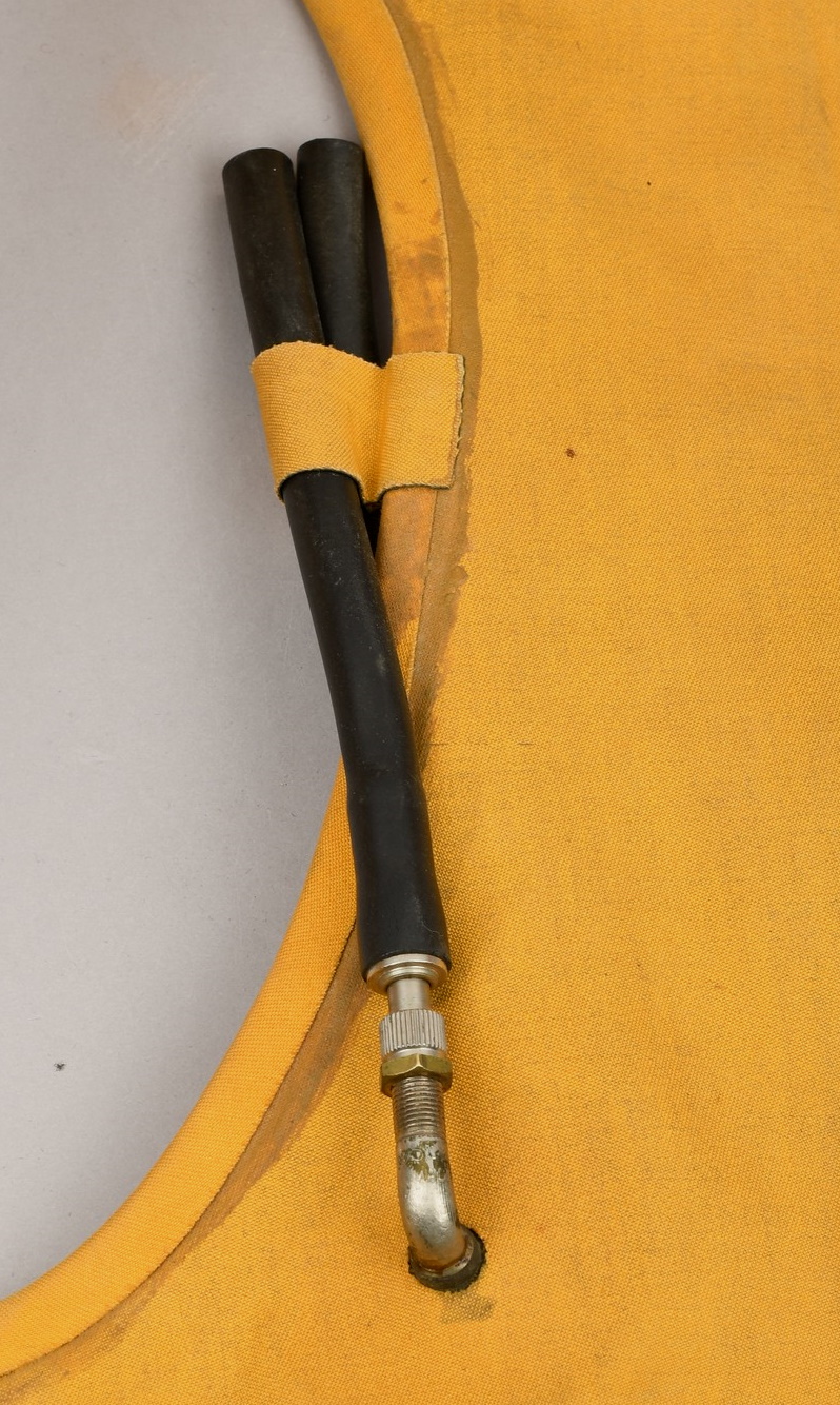 A cotton and latex rubber pneumatic life vest with adjustable straps that wrap around the waist and pass through the legs. It can be inflated by Co2 cylinders that are present to the bottom of each side that are activated by pulling the white cord. The life vest is marked “AN6519″, date of manufacture: Feb 15, 1945″, Property U.S. Government.” In very good condition with light signs of age.
